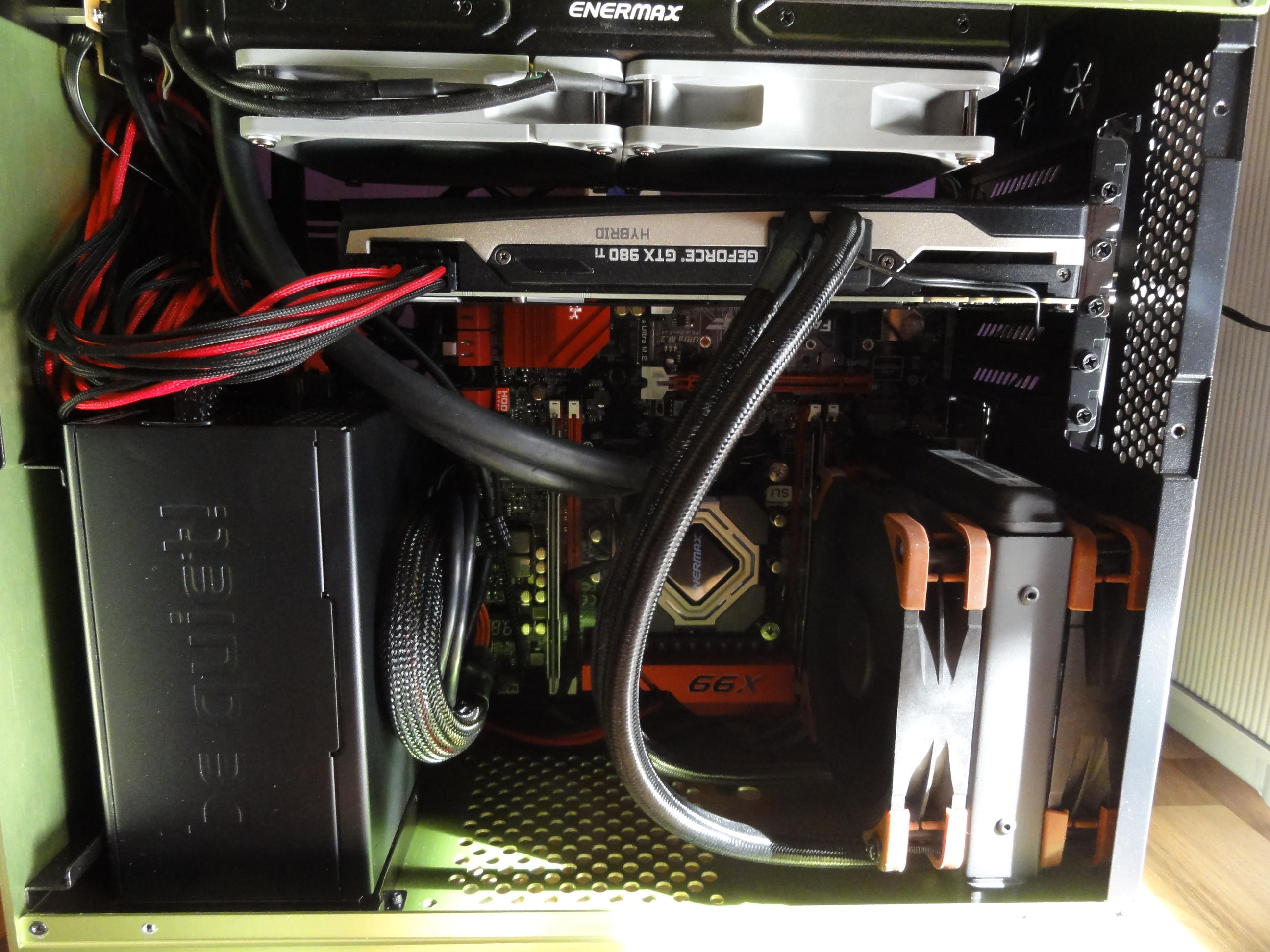 Mit den Lüftern muss ich mal schauen, der Gehäuskönig schrieb glaub ich, dass unten ein 120er Luft rein schaufeln und hinten der 120er rausschaufeln soll. Nun saugt das Netzteil noch zusätzlich ab und pustet unten raus, direkt neben dem Einstrom... Oben wollte ich für die Graka frei halten.