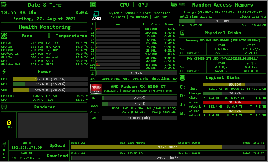 Wenn ich am PC arbeite, sehe ich den Desktop auch nur selten auf meinen Monitoren. Aber wenn ich zocke und meine Hardware beanspruche, dann läuft nicht viel anderes währenddessen und die Desktops zeigen mir dank Rainmeter die aktuellen Werte einiger wichtiger Sensoren der Hardware (Auslastungen, Temperaturen, Lüfter, Datenraten).