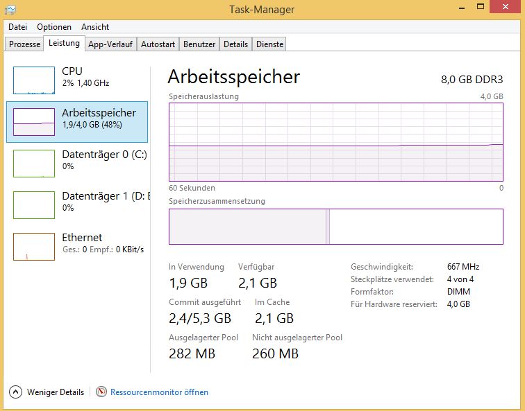 habe seit kurzem das Problem, dass im Bios/UEFI 8 GB RAM (alle Slots belegt) erkannt werden, so wie es sein soll. Unter Windows hingegen werden 4GB von 8GB im Taskmanager angezeigt, allerdings auch dass alle 4 Slots belegt sind. 4GB von den Ganzen 8GB sollen für Hardware reserviert sein.