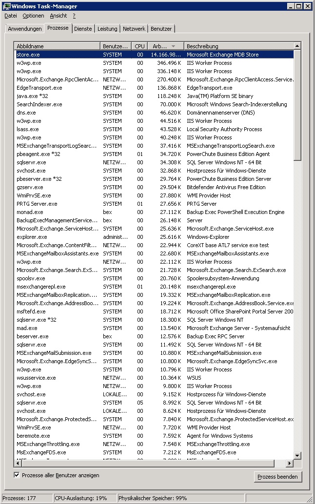 Jetzt ist die RAM Auslastung aber dennoch meist auf 100% und die store.exe (Exchange) genehmigt sich ~15GB davon.
