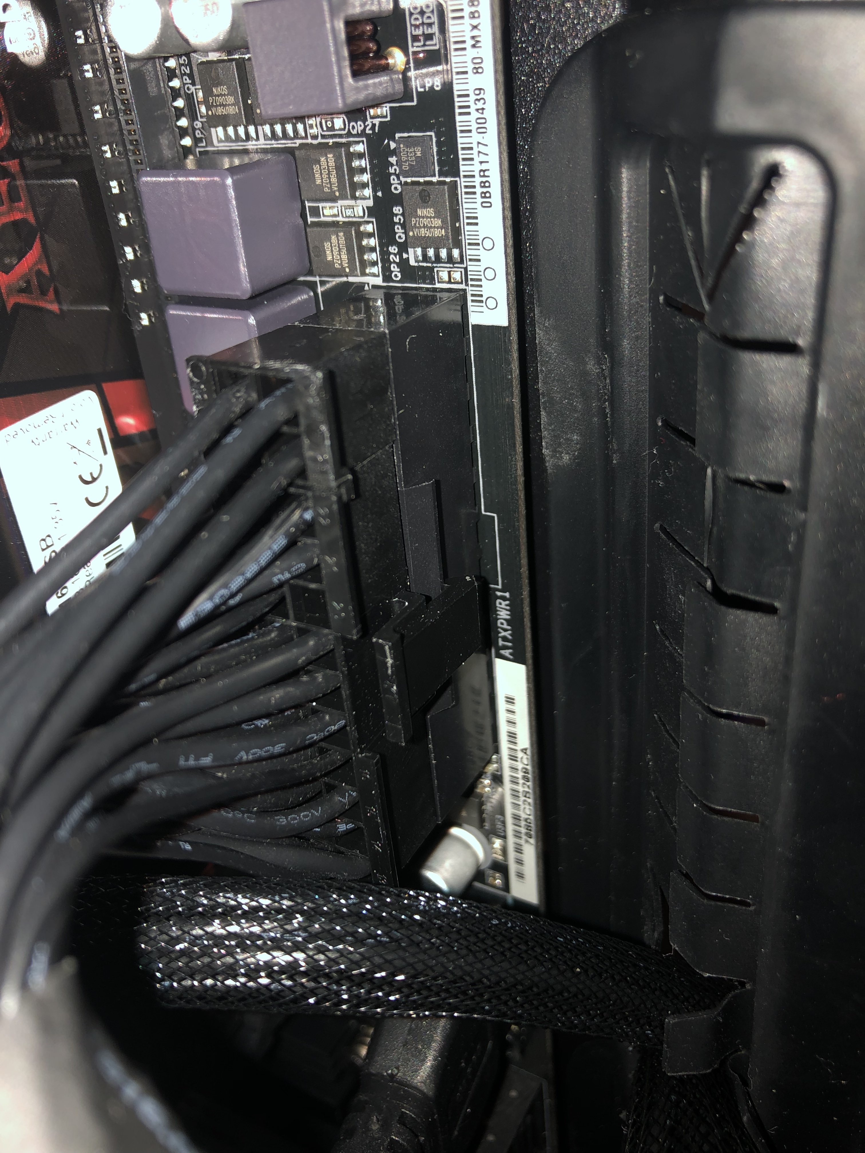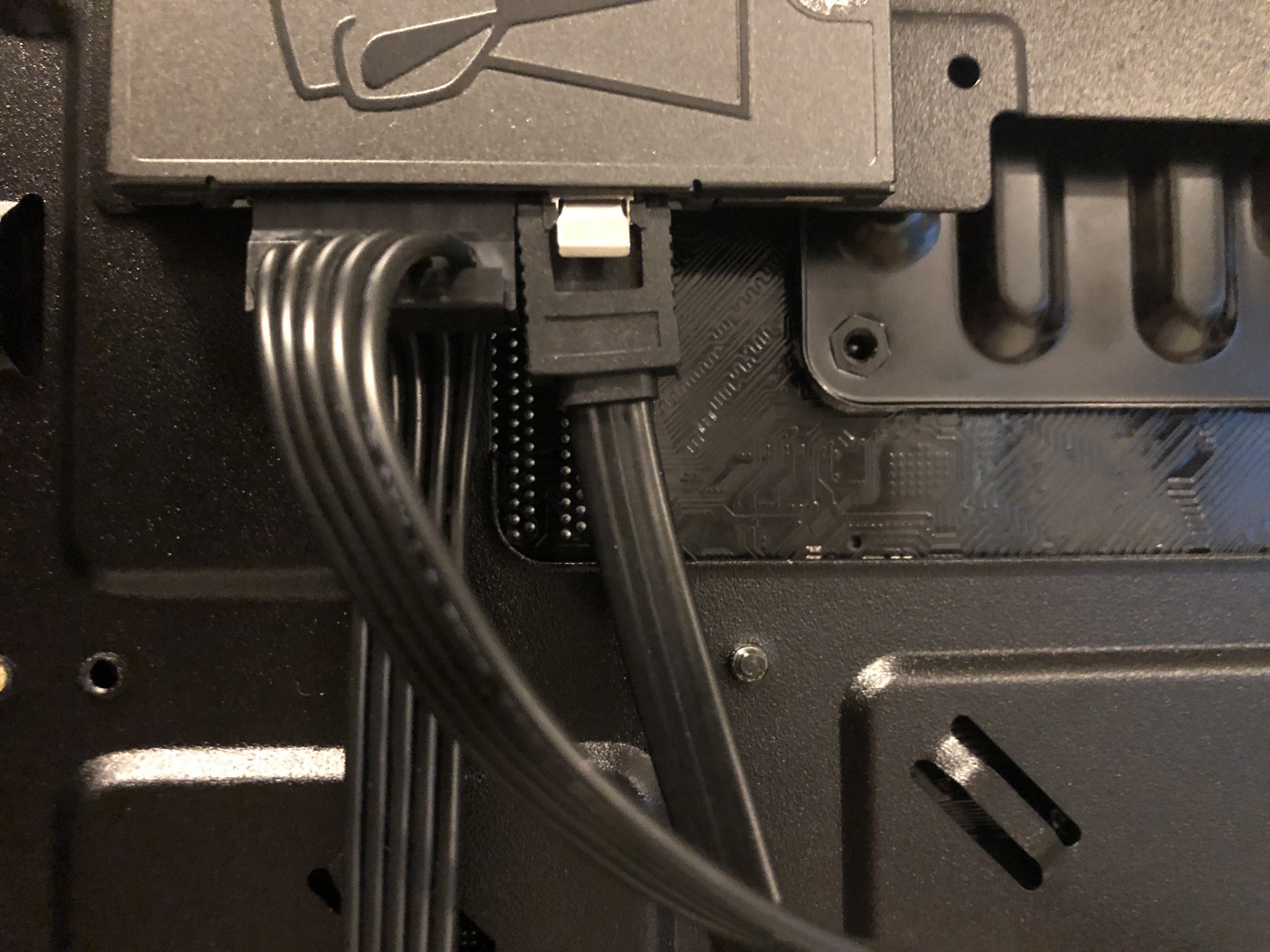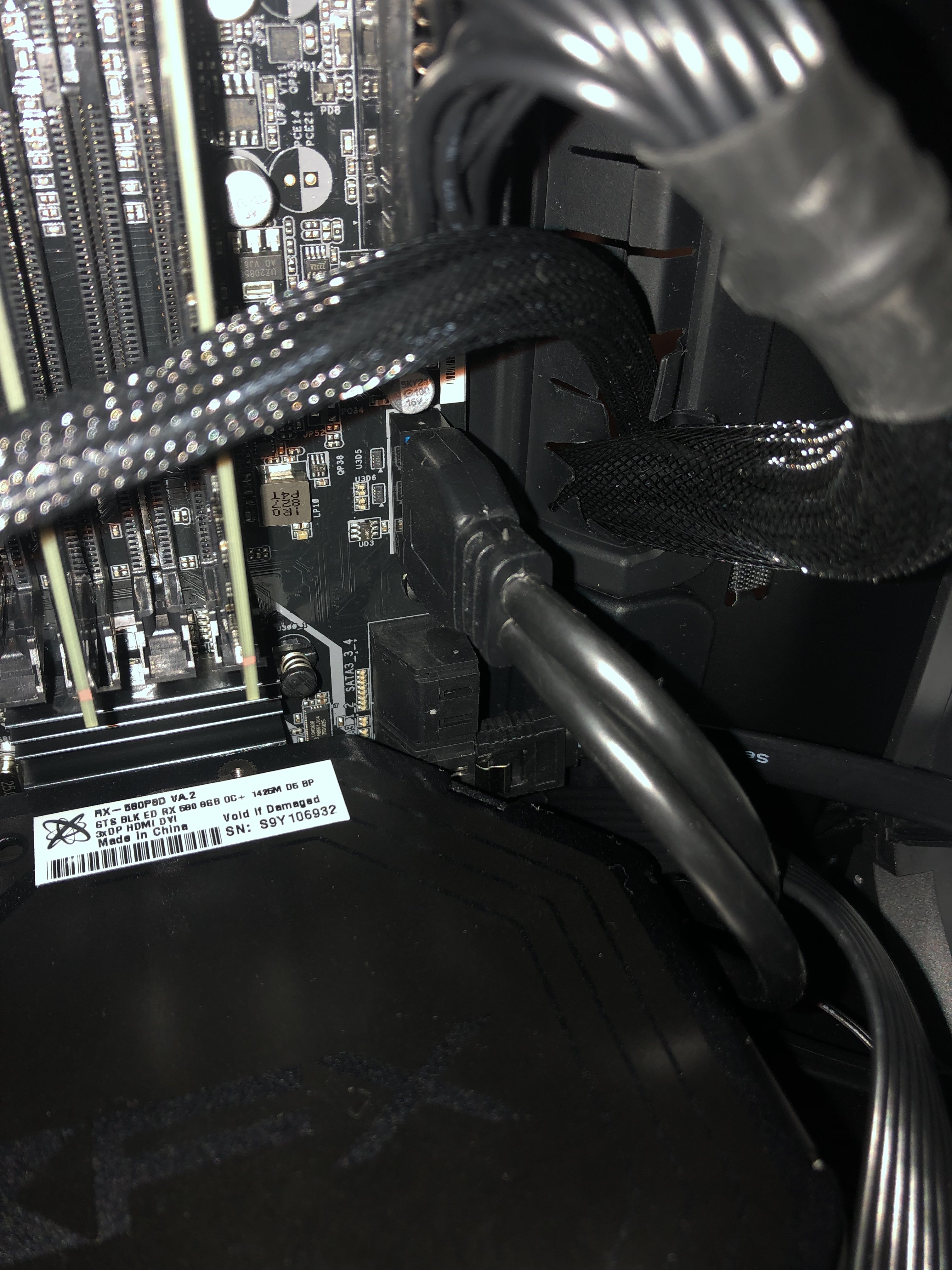 Eigentlich sind alle Kabel da, wo sie sein sollen. Das Sata Festplattenkabel (Bild B757) sitzt aber ganz schön auf Spannung, da würde ich zur Sicherheit versuchen, ein Kabel mit schmaleren Anschluss zu erwerben (der Pc sollte aber auch ohne Festplatte bis zum Bios kommen).