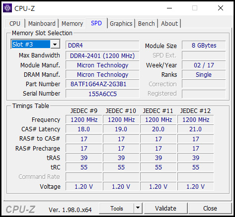 Slot3: 8GB Micron Technology DDR4 2400 (8ATF1G64AZ-2G3B1)