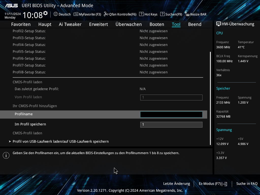 da es keine Möglichkeit gibt ein altes Profil in einem geupdateten BIOS/UEFI wieder zu laden, habe ich folgende Überlegung. Anstatt 20 Seiten mit Settings zu fotografieren, ist es doch einfacher, wenn man aus dem bereits stabilen Profil heraus eine Liste angezeigt bekommt NUR mit den Settings, die man verändert hat. Das bekommt man, wenn man die "optimized defaults" lädt und dann das Bios verlässt.