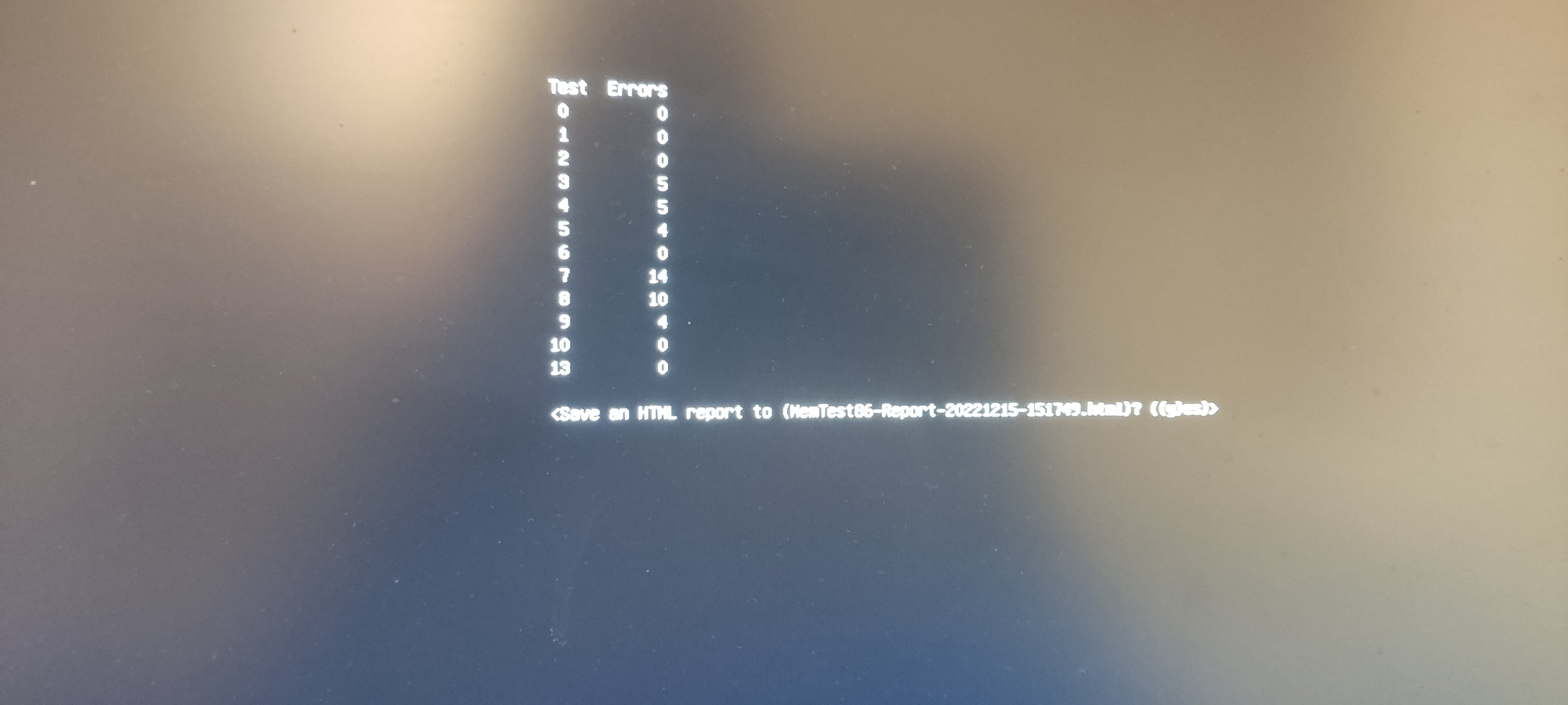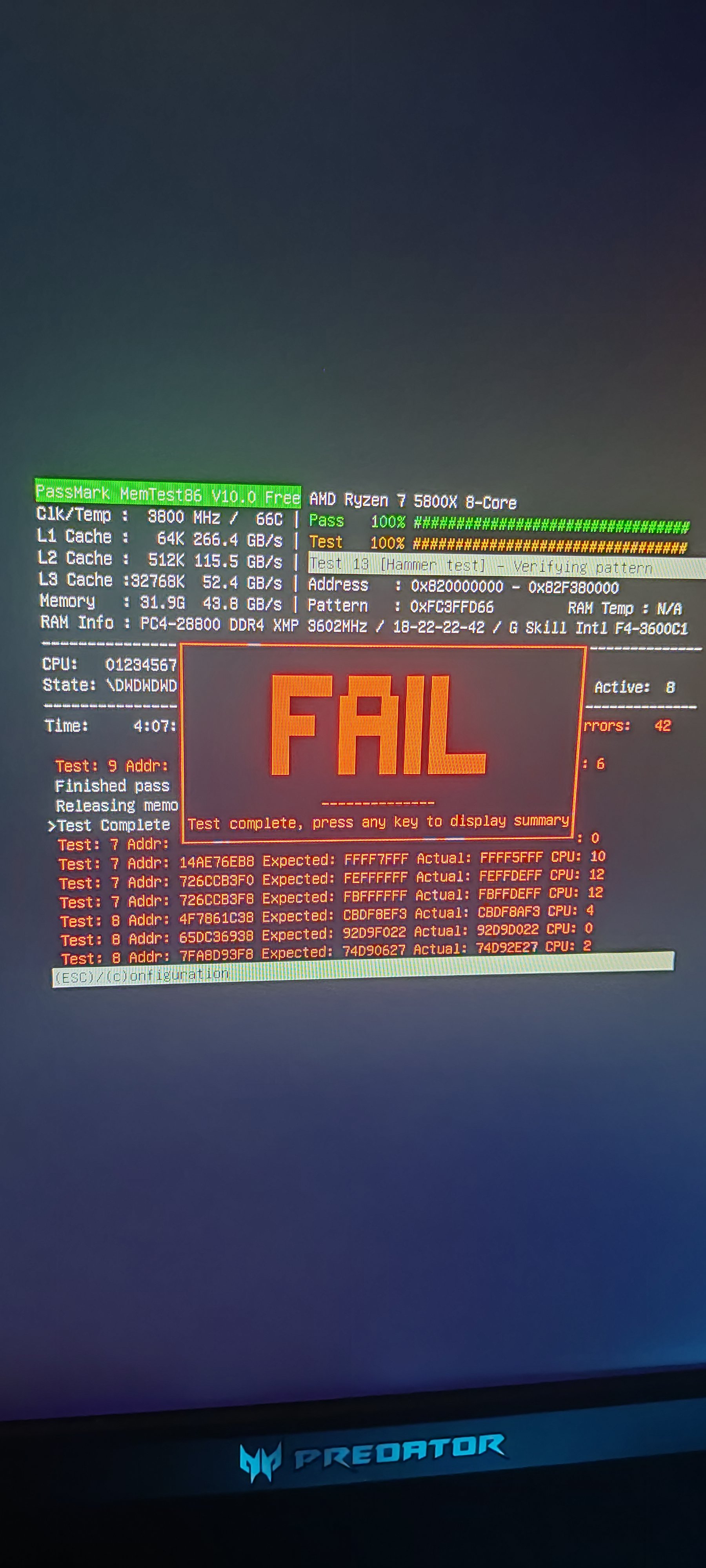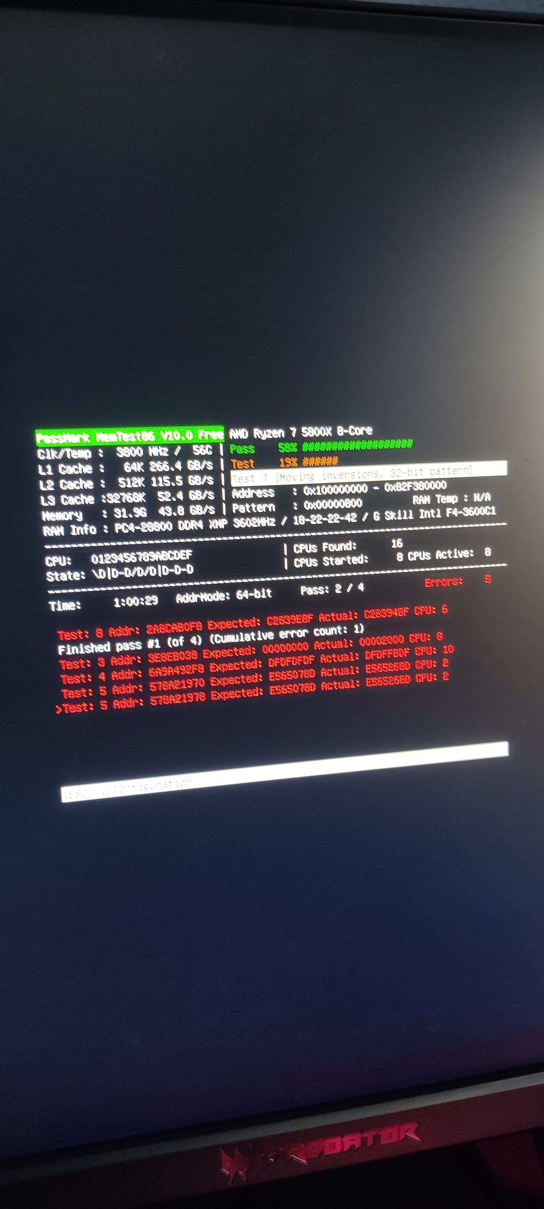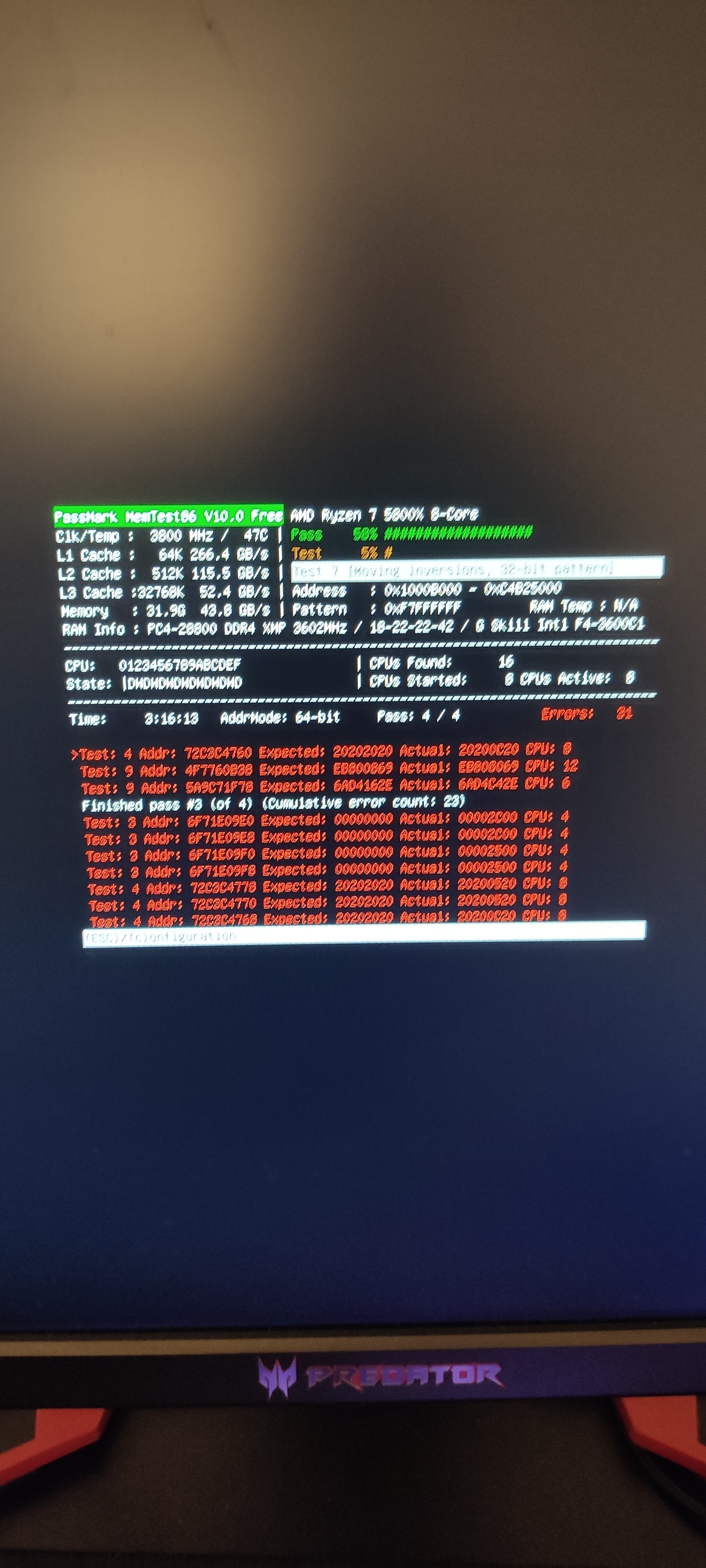 Sobald der Test einen Fehler anzeigt kannst du bereits abbrechen und den anderen Riegel testen. RAM sollte Fehlerfrei sein. Hat er auch nur einen Fehler ist der RAM schon nutzlos. Du kannst jetzt noch rausfinden ob beide Riegel betroffen sind oder nur Einer. Zurücksenden soll man aber das ganze Kit. ¯\(ツ)/¯