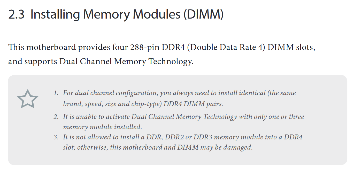 Dann befass dich lieber vorher mit der Thematik anstatt einfach loszulegen. Einer der zwei RAMs steckt im falschen Slot, siehe die Abbildung deines Mainboards oben