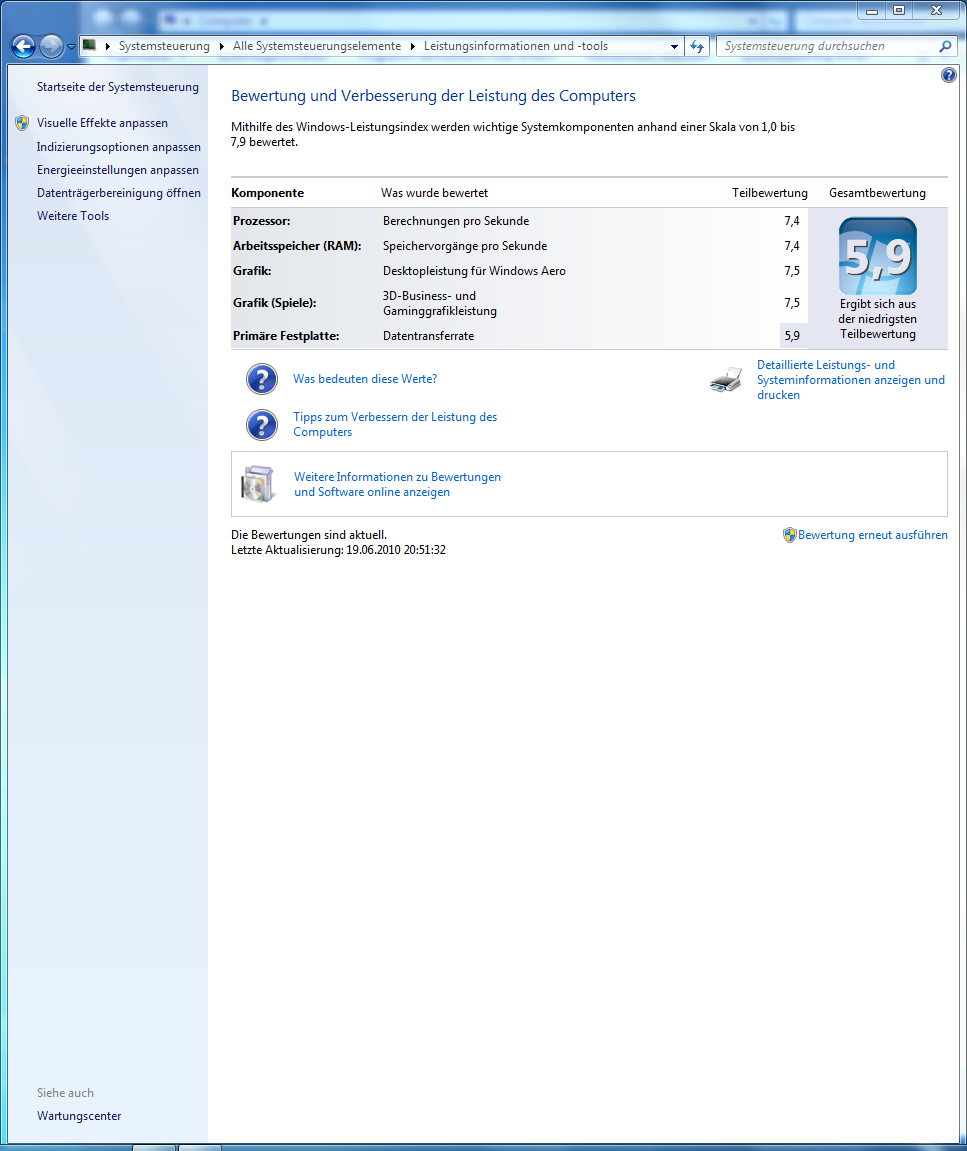 Erst mit SSD´s kommen da mehr Punkte. Die Systembewertung ist leider kein Indiz für irgendwelche Probleme.