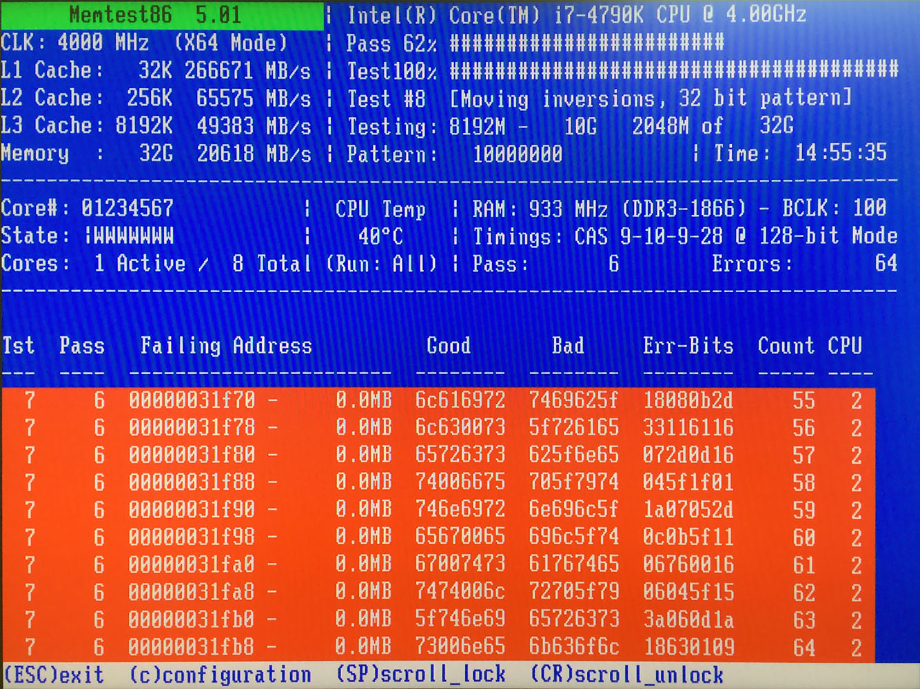 Fehlerbild: Memtest 86+ 5.01 und MemTest 86 Pro 6.20 zeigen RAM-Fehler bei den intensiveren Tests, also meistens ab dem zweiten Durchgang.