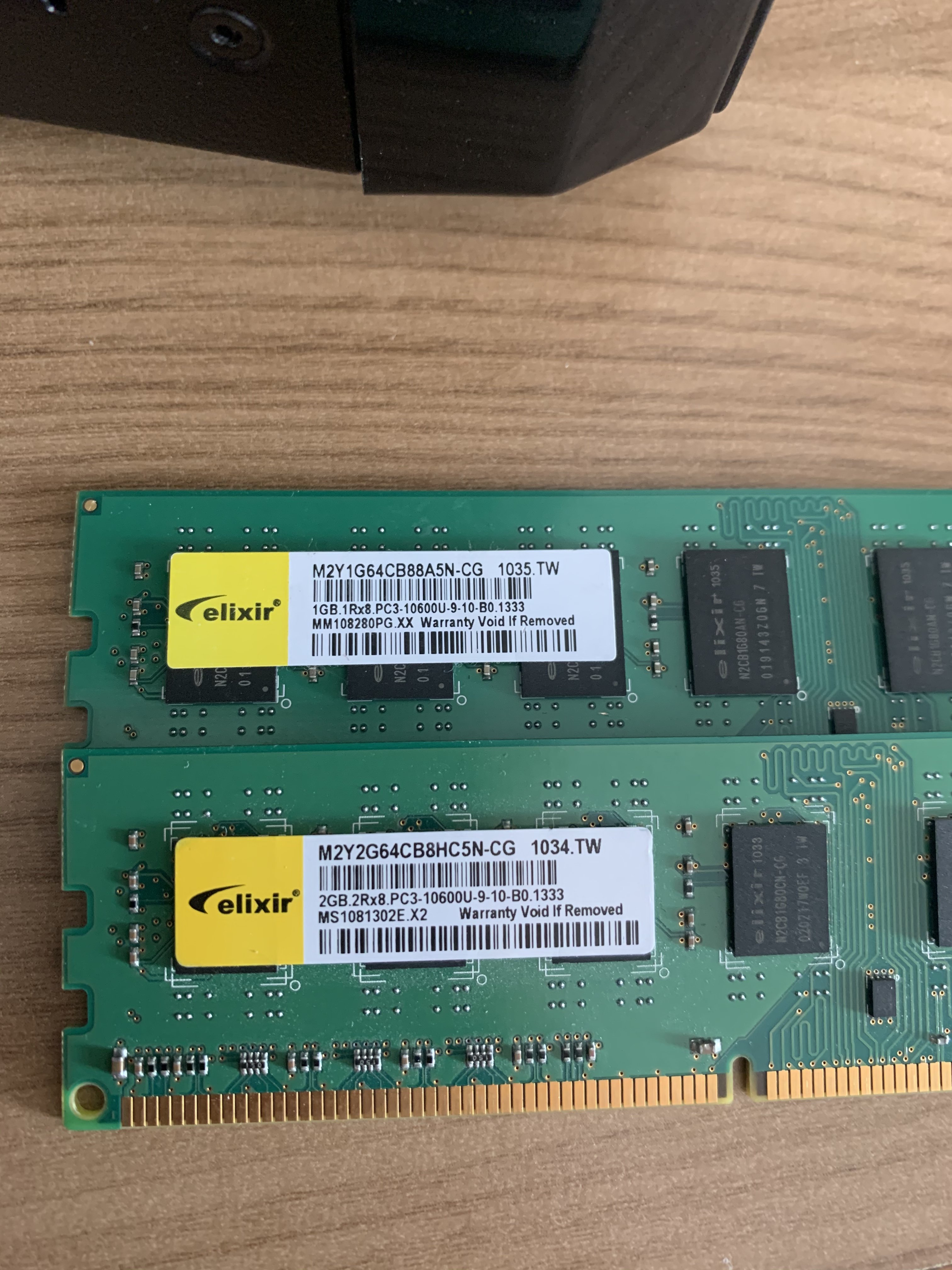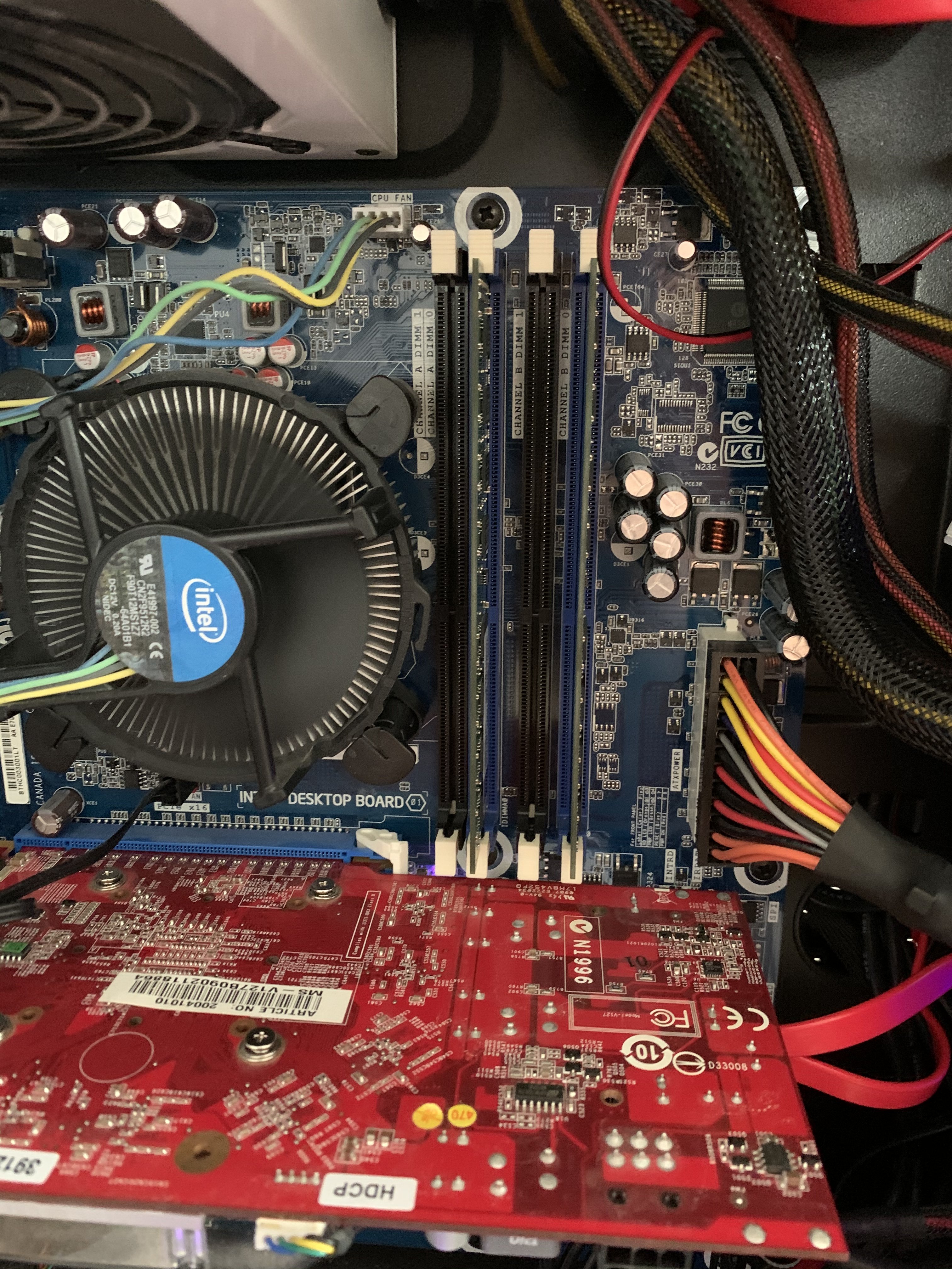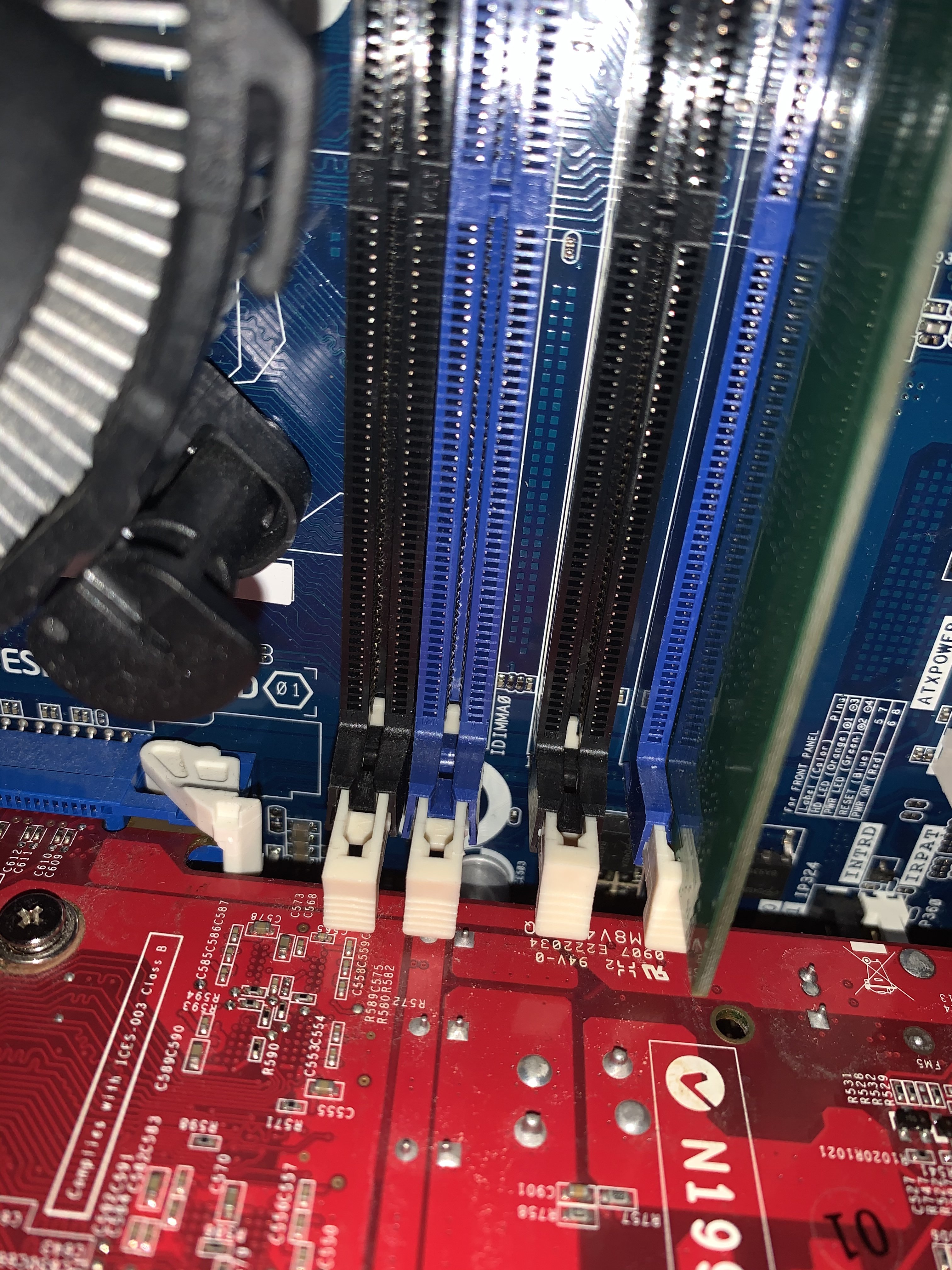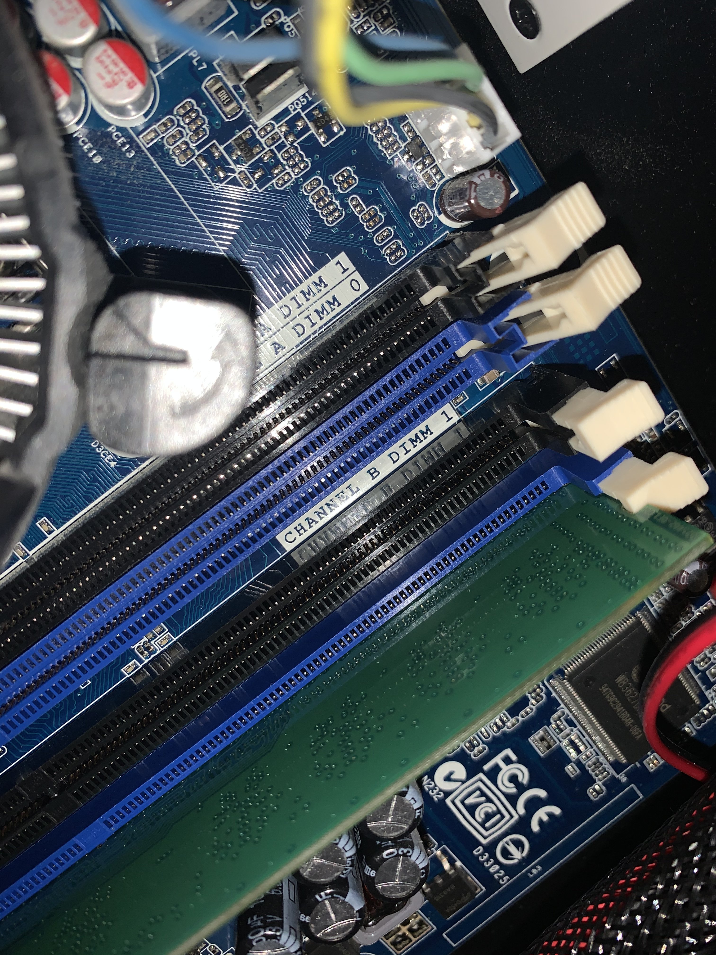 Rumliegen. (Die blauen auf den Bildern) habe dann den pc gestartet aber es kam dreimaliges piepsen (RAM Fehler) also habe ich sie wieder ausgebaut und einfach die zwei 1Gb Riegel die davor drin waren drin gelassen. Jetzt jedoch werden mir aber nur noch 1Gb angezeigt. Die beiden Riegel funktionieren das habe ich getestet es ist der linke Bereich wo keiner der beiden mehr geht.