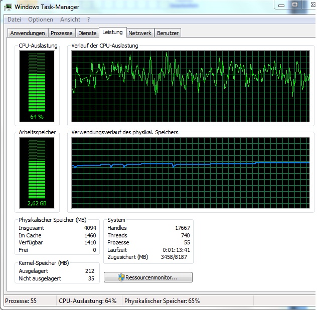Ich habe beim Spielen in letzter Zeit immer wieder das Problem, dass wenn ich spiele, der RAM quasi "vollläuft". Nach einiger Zeit spielen werden Spiele(z.B. BF3 und MW3) zunehmend schlechter von der Performance her. Wenn ich ein Blick auf die RAM-Auslastung im Task-Manager beim Spielen werfe, sehe ich, dass der freie Physikalische Speicher immer weniger wird, mitunter auch auf 0 geht. Ich besitze 4 GB RAM in einem 64-Bit Ultimate Windows 7, das müsste meiner Meinung nach locker für Spiele wie MW3 reichen. Auslagerungsdatei lasse ich von Windows auf C: verwalten, weil man da eh nur unterschiedliche Meinungen zu liest. Anbei hänge ich mal einen Screenshot vom Task Manager beim Spielen, großartige andere RAM-fressende Programme habe ich nicht offen. Betriebssystem ist relativ frisch(3 Monate alt).