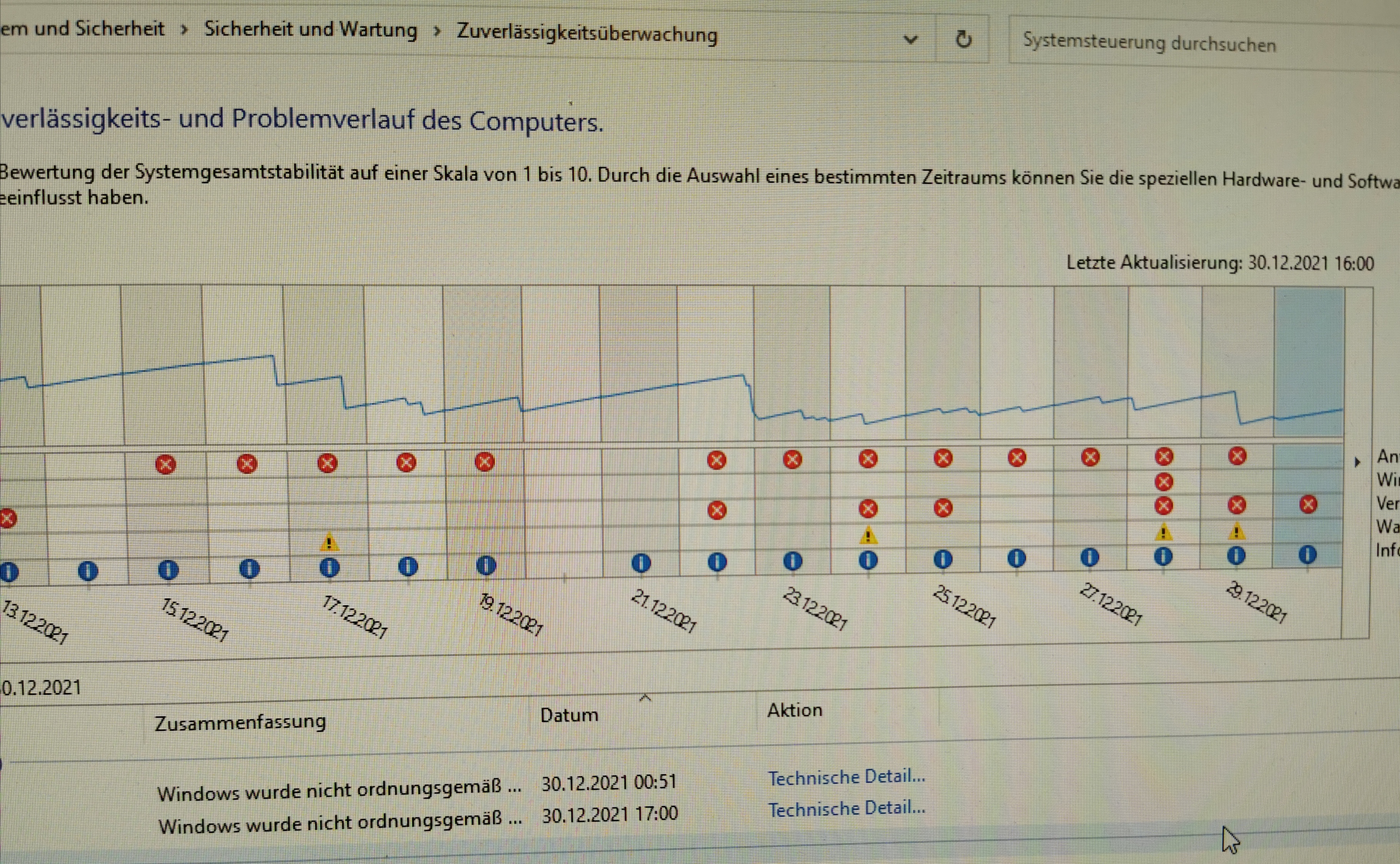 Gute Anlaufstellen sind bei Windows bei Fehlern zuerst der Zuverlässigkeitsverlauf, sind dort Fehler drin die mit Software zu tun haben diese erstmal ausmerzen und auch anhand der Zeit Stempel die nächst Anlaufstelle nutzen. Die Ereignisanzeige, so kommt man vielen Problemen auf die Schliche.