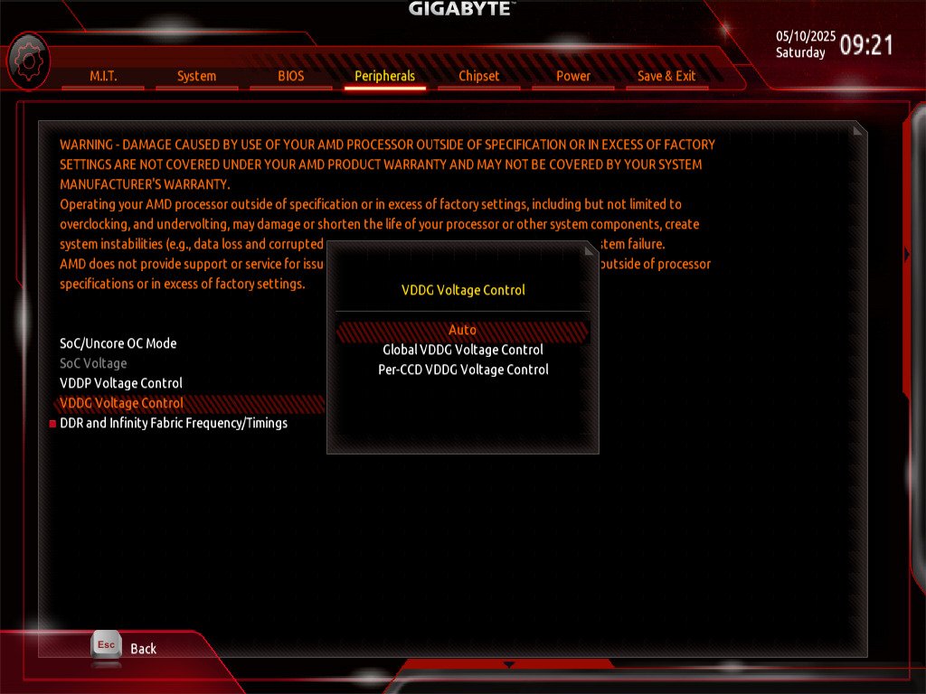Unter "AMD Overclocking" findet sich der Punkt "SoC Voltage", den ich testweise auch mal auf 1100 mv angehoben hatte. (Ehrlich Gigabyte. Schreibt doch bitte wenigstens da hin, dass der Wert in mV angegeben werden muss. Hab ich auch nur durch Google-Fu herausgefunden. Standardwert ist "0". Ja was? Äpfel?)