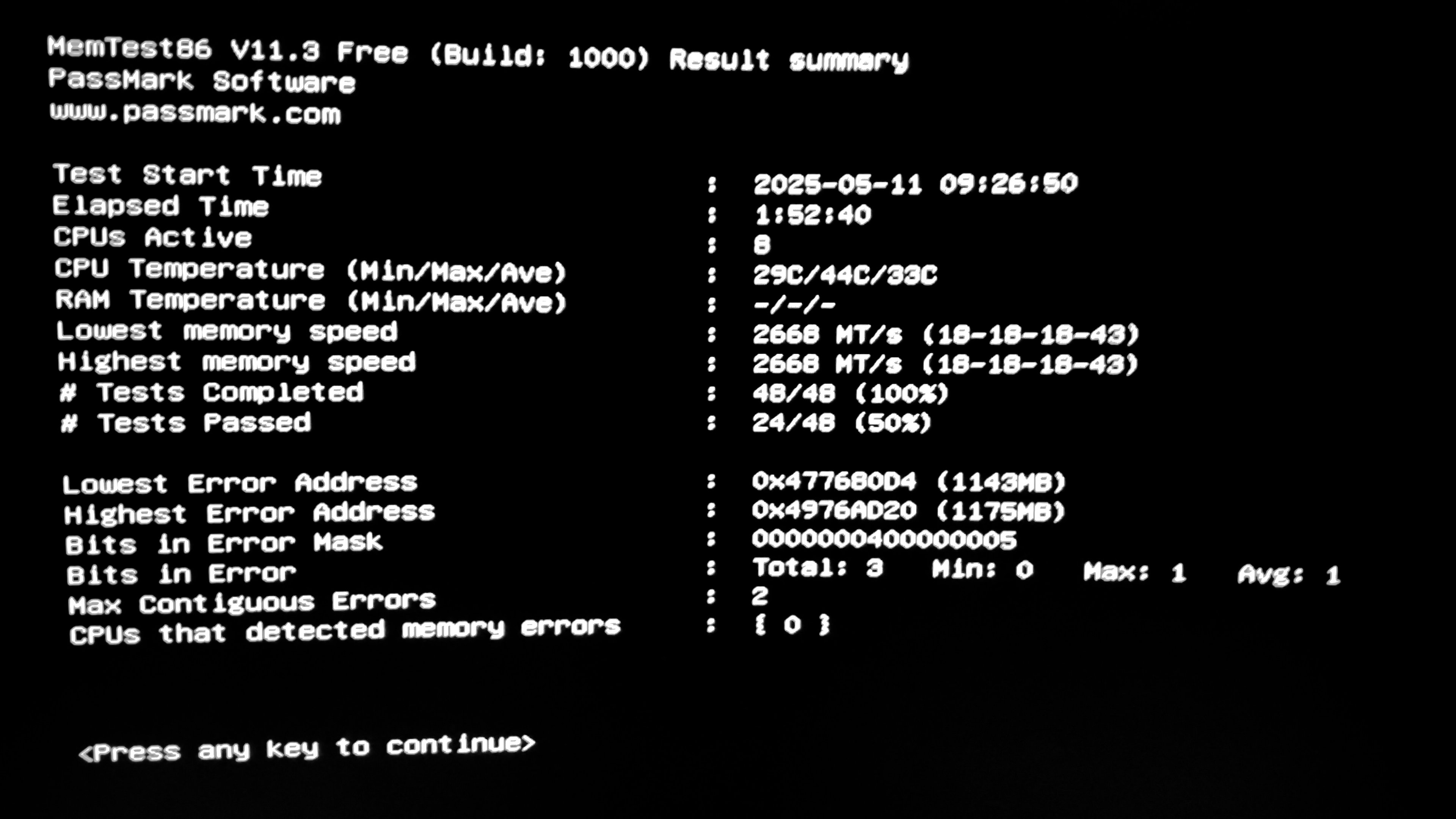 Die Stabilität des RAM-Speichers habe ich nach dem Zusammenbau jeweils mit MemTest86, für ungefähr vierundzwanzig Stunden auf Stabilität getestet.