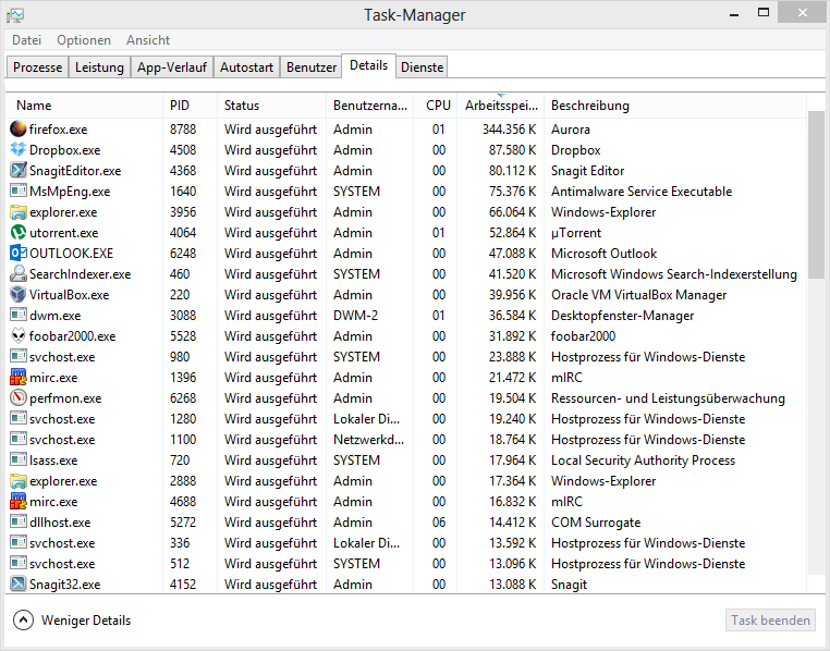 ich habe ein kleines RAM-Problem unter Windows 8 Pro x64 und zwar läuft mir nach einigen Tagen Laufzeit der RAM voll. Im Task-Manager sieht man das am "Commit ausgeführt"-Wert, der sich immer weiter von "In Verwendung" abhebt, bis er schließlich nah zu den maximalen 12GB kommt und ich den PC neustarten muss, da jedes neue geöffnete Programm abstürzt (Auslagerungsdatei ist deaktiviert).