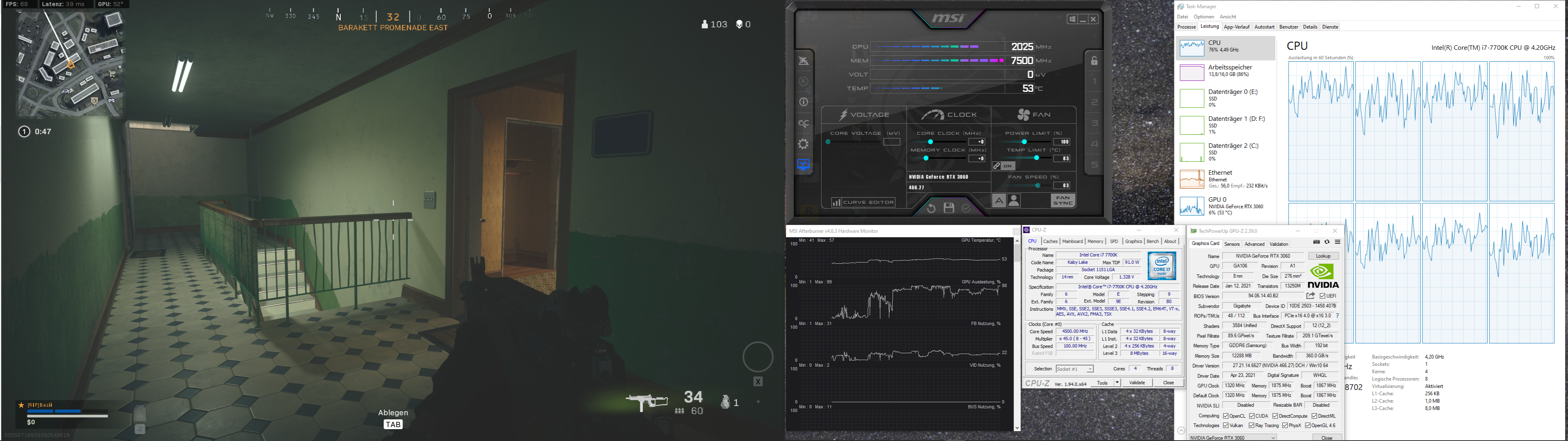 In Warzone läuft CPU auf 100%, Ram auf 86% und laut Taskmanager die GPU auf 3%, im MSI Afterburner auf 100%.