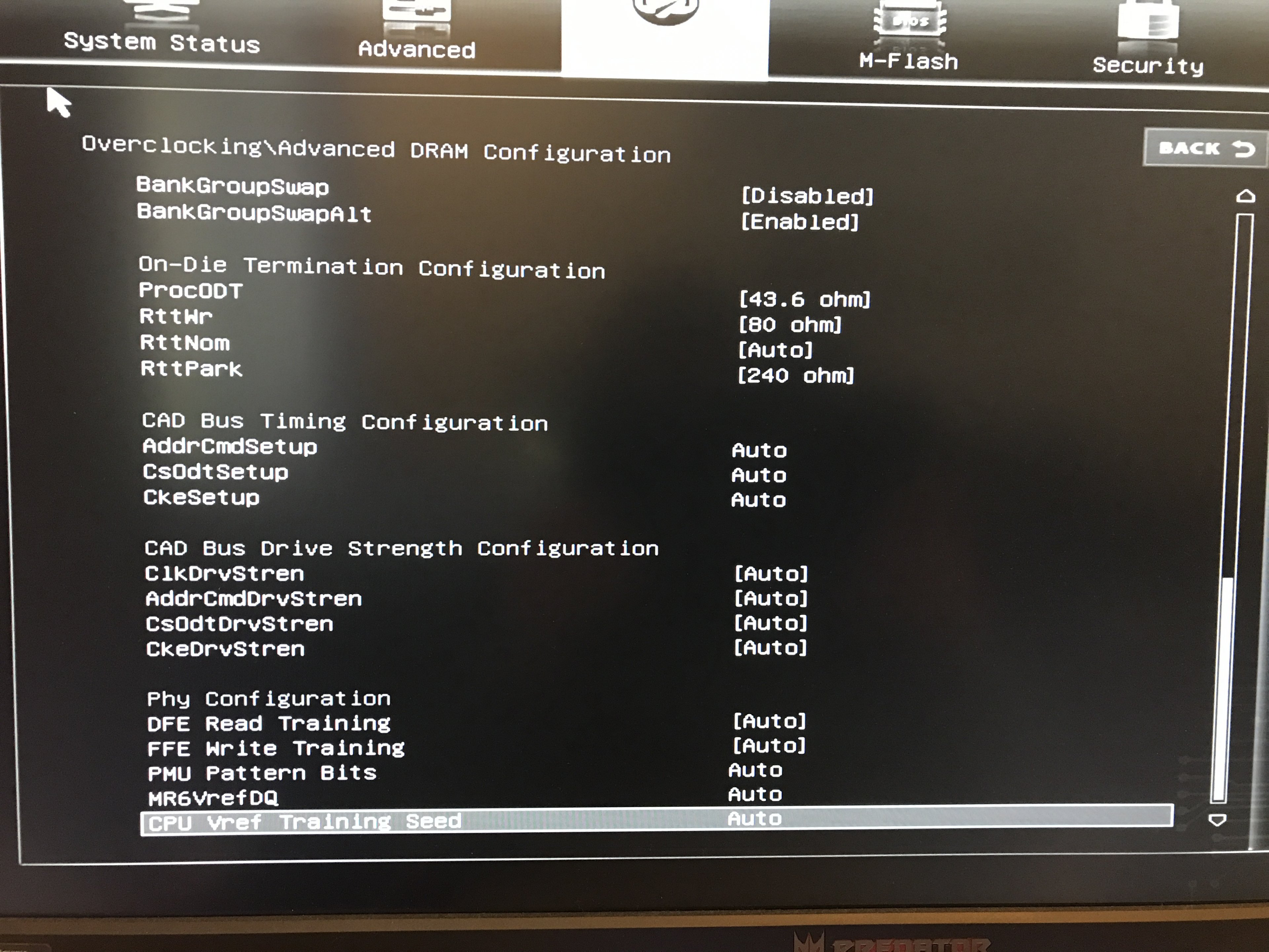 Beispiel: cad_bus ClkDrv sollte 40 sein. Du hast unter clkdrvstren Auto stehen. Das gilt für alle Werte auf der rechten Seite vom Dram Calculator. Die anderen Werte 20-20-24 sollten da auch eingetragen werden.