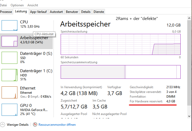 3 Riegel funktionieren einwandfrei außer wenn ich die mit ein bestimmten Ram kombiniere dann reserviert er 4GB für Hardware.