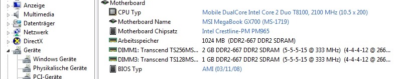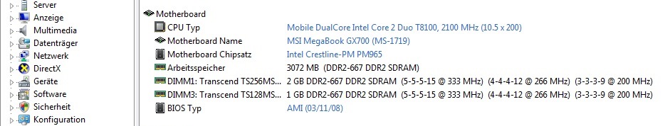 Mir ist aufgefallen, dass unter Leistung ist als physikalischer Speicher nur 1023 habe und "DAS KANN NICHT SEIN". Unter Systeme auch nachgecheckt und da steht als installierter Arbeitsspeicher auch 1GB. So, die dritte Überprüfung bei AIDA64 Extreme ergab ebenfalls "Arbeitsspeicher 1024MB". Aber wie kann das sein? Ich habe 4GB RAM gehabt und bin mir absolut sicher, da ich ab und zu im TaskManager kontrolliere was da vor sich geht und da habe ich 4GB gehabt!! Ist eventuell mein RAM kaputt oder was? CCleaner, defragmentieren usw. hab ich gemacht und mache es regelmäßig. Ich habe auch seit 1 Stunde hier auf der Seite und in anderen Foren über den Physikalischen Speicher usw. gelesen, alles nochmals kontrolliert und jetzt bin ich fraglos.