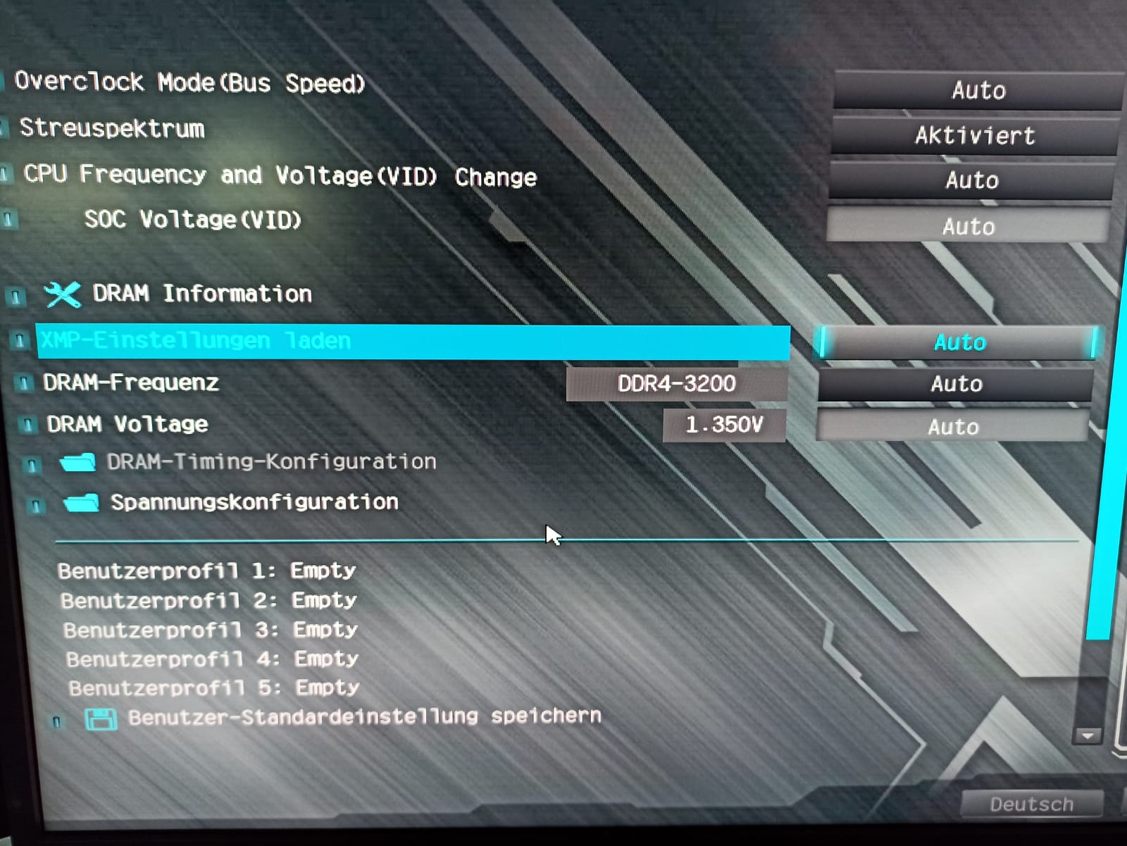 Ich habe die Möglichkeit im BIOS ein voreingestelltes XMP setting aufzurufen wo die Timings eigendlich passen sollten! wenn ich dies jedoch mache startet mein Windows nicht mehr! stelle ich alles wieder auf Auto startet es wieder.
