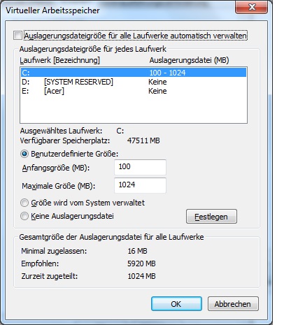 • von den Einstellungen bei der Auslagerungsdatei (=>Windowstaste u. Pause/Untbr. drücken => Links auf "erweiterte Systemeinstellungen" klicken => oben bei Leistung auf "Einstellungen..." klicken => den Reiter/Tab "Erweitert" auswählen und die Schaltfläche "Ändern" auswählen)