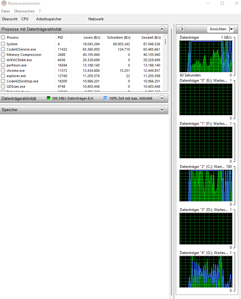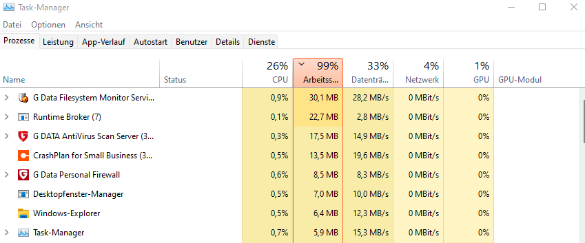seit gestern passiert es immer wieder, dass mein PC von jetzt auf gleich stockt und RAM und SSD zu fast 100 Prozent ausgelastet sind - ohne erkennbaren Grund. Zum Beispiel wenn der Rechner erst ein paar Minuten an ist und ich nur in Chrome im Netz surfe. Nur ein Neustart hilft dann.