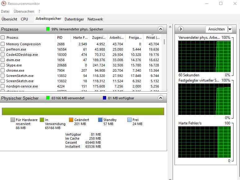 Also du kannst auch im Resourcen-Monitor schauen, was einen großen Arbeitsspeicherbedarf hat, oder auch mal Process Monitor nehmen vielleicht.