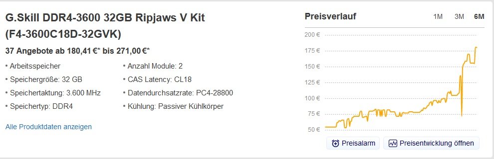 Wenn man sich die Preisentwicklung für 32GB Kits G.Skill DDR4-3600 CL18 anschaut, von 77€ bis 94€ im September (vorher wars noch neutlich billiger) auf inzwischen 180€