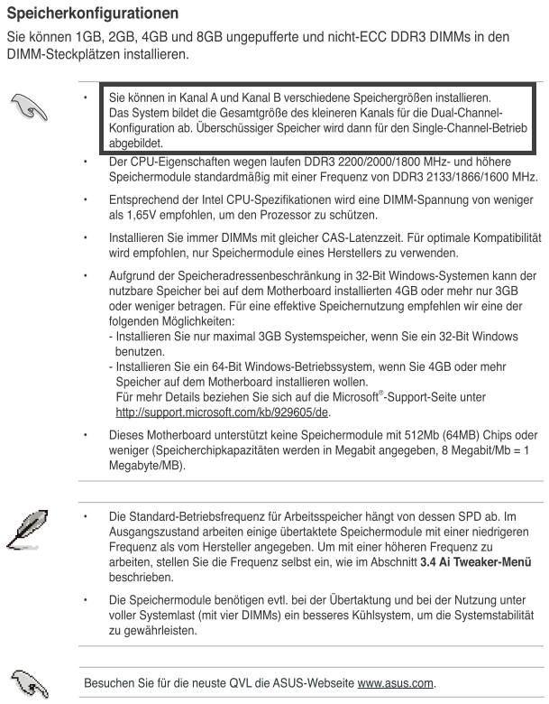 Warum sich mit RAM-Vollbestückung mögliche Probleme (hier im Forum sehr oft Thema) ins Haus holen, wenn man mit 1x8GB problemlos erweitern kann? Dual-Channel funktioniert dann auch weiterhin, denn was der Z68-Chipsatz (siehe Bilder) kann, das kann der Z77 erst recht. Auch im Board-Handbuch steht nichts von einer "Doppelbestückung". Im Gegenteil, es erklärt sogar den Dual-Channel bei unterschiedlich bestückten Speicherkanälen (siehe Auszug Handbuch).