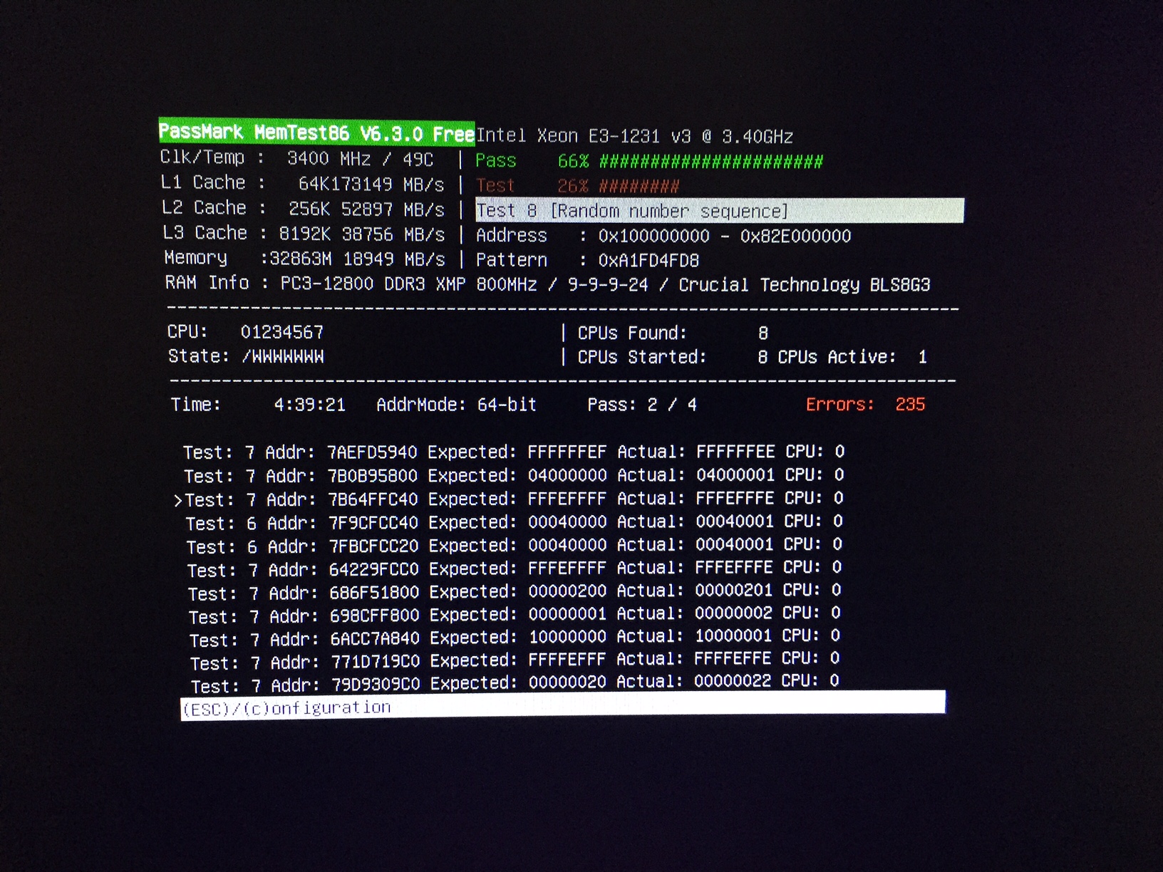 Habe jetzt gute 5 Stunden den Memtest86 laufen lassen und er hat im zweiten Durchlauf 235 Fehler gefunden. Dann habe ich den Test abgrebrochen. Ist der Speicher defekt oder soll ich mal versuchen die Spannung zu erhöhen?