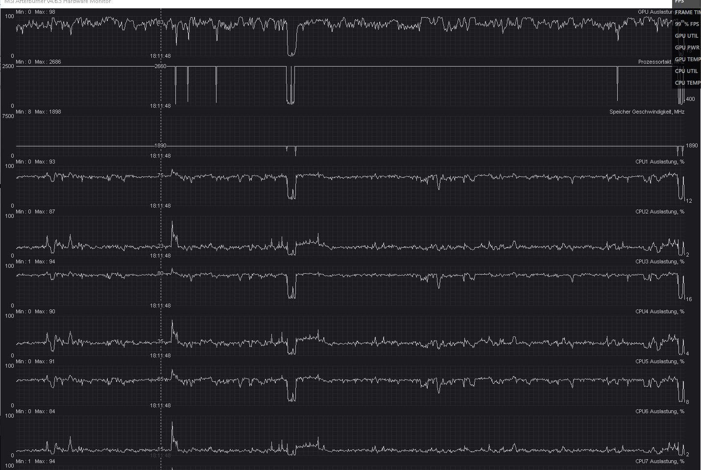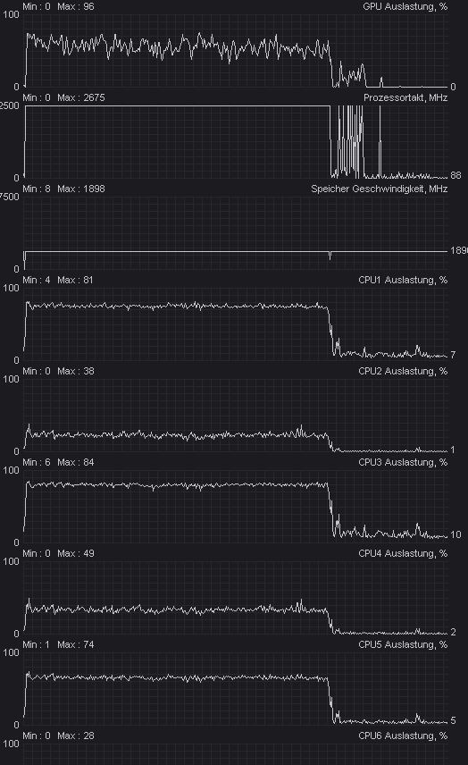 - MIT MSI Afterburner gegengechecked: Wenn die GPU Utilization sinkt, sinkt gleichzeitig auch die CPU Utilization – jedoch deutlich weniger stark (zB CPU 1 von ~72% auf ~68%)