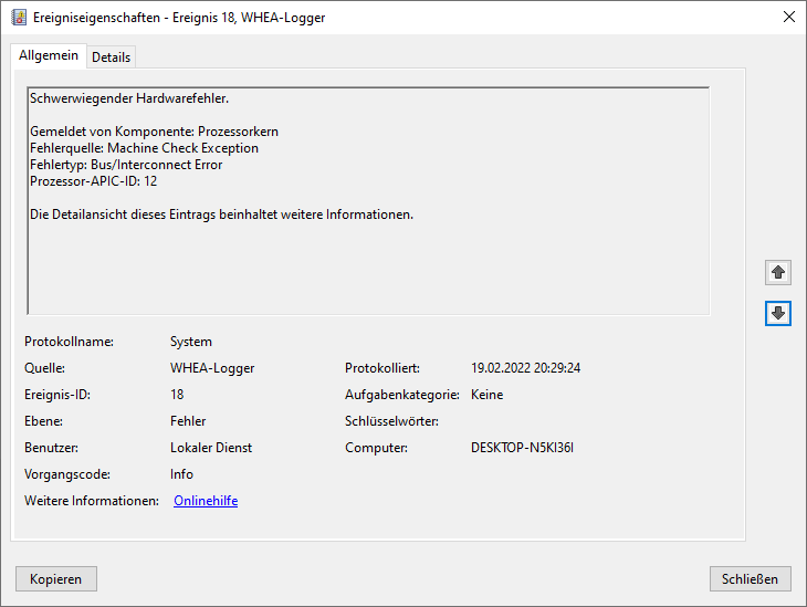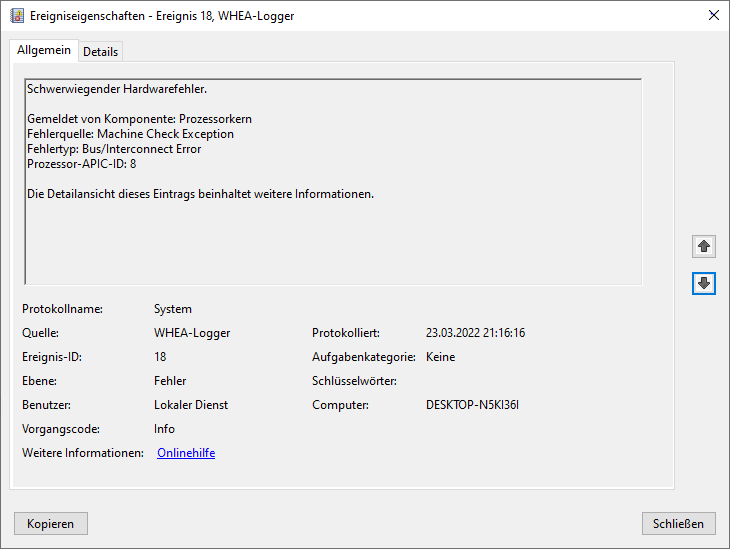 Ereignislog ist "nur" als einziger Critical der Kernel-Power41 (63)