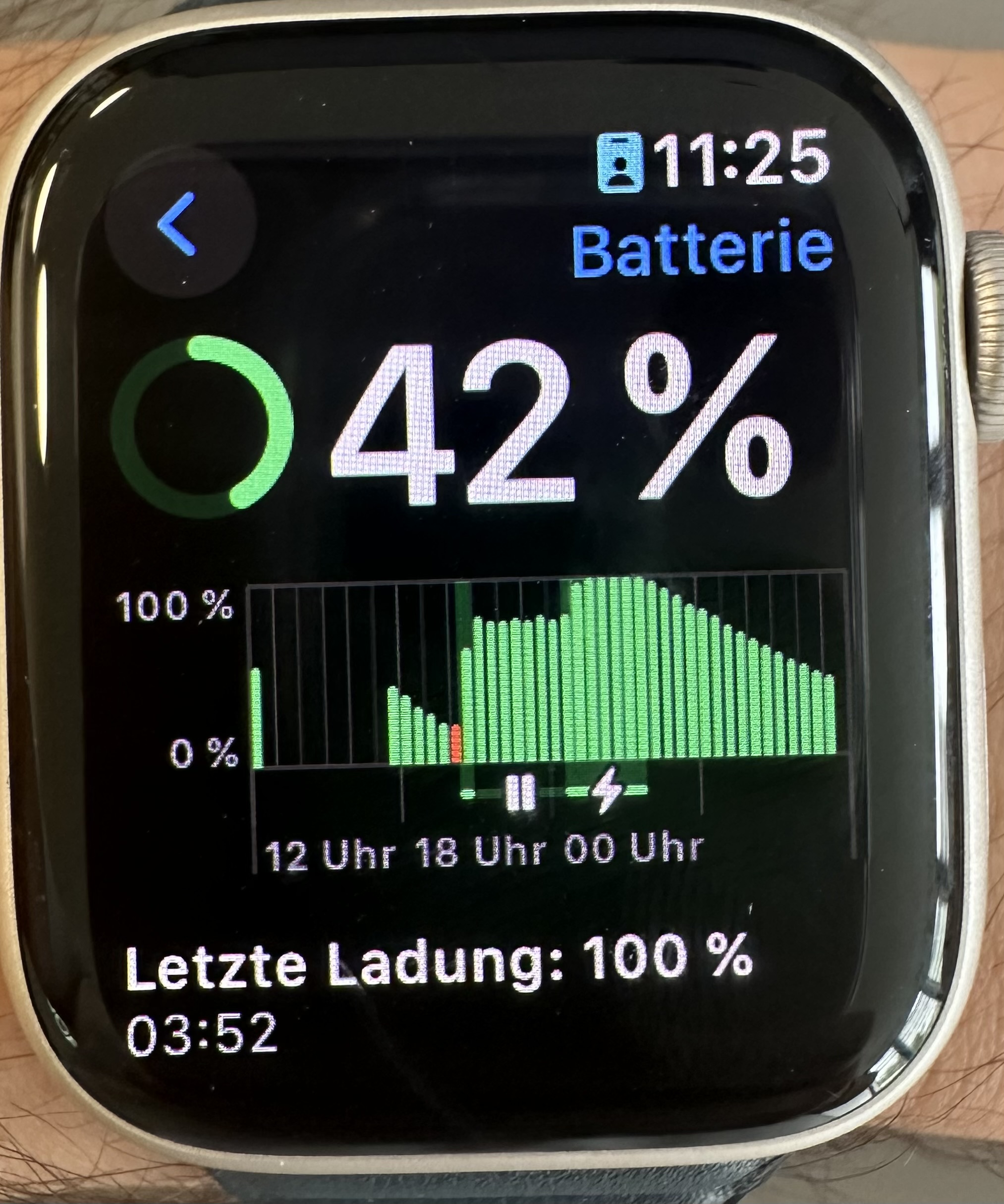 Watch auf 100 % aufgeladen (über Nacht) um 7:00 Uhr abgezogen, mit der Bahn zur Arbeit gefahren und keine Aktivitäten auf der Watch getrackt.
