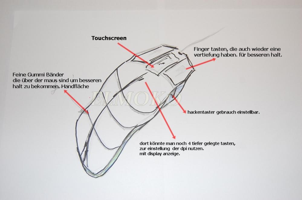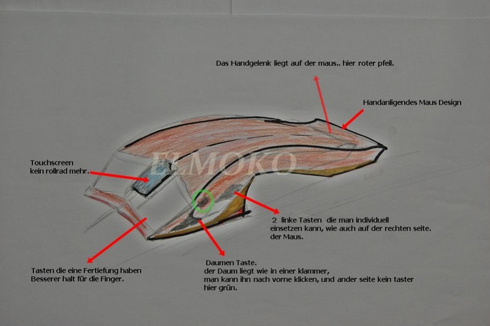 Handgelenk auf der Maus sehe ich etwas kritisch weil es sehr restriktiv ist, Toucpad anstatt Wheel würde mir zu wenig Feedback geben, deine Daumentasten sind etwas gar weit vorne.