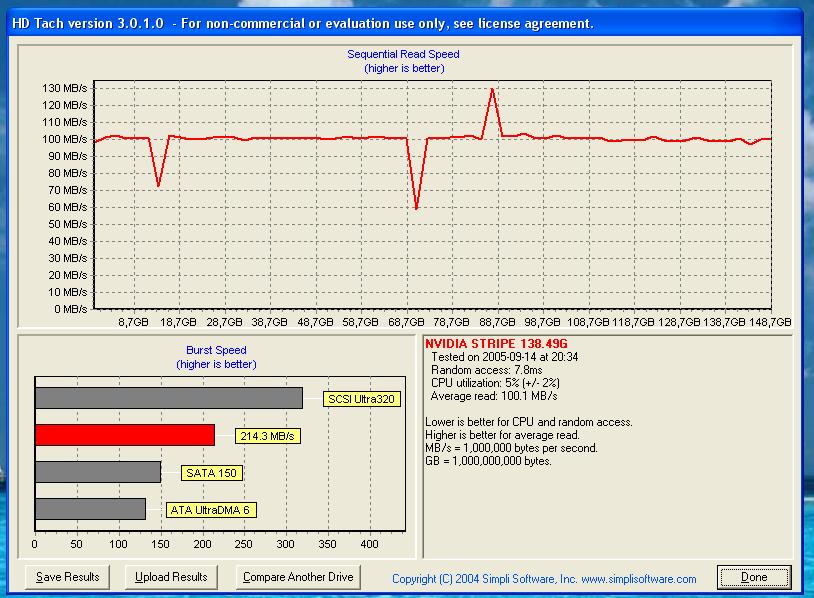 Ja ich weis dass das ein Intel Raid ist. Nur mein NForce rennt nicht wie deiner bei 100MB/s in den Begrenzer? Ist bei dir ja ne gerade Linie. Müsste aber eigentlich von oben her absteigen. Sieht fast so aus wie ein Controller der am PCI-Bus hängt. Komisch. Ist wohl der berühmte NForce 4 Raid Bug. Hab ich wenn ich 3 oder mehr Raptoren im Raid hab. Dann bremst sich das ganze System auf dashier ein: -> Bild