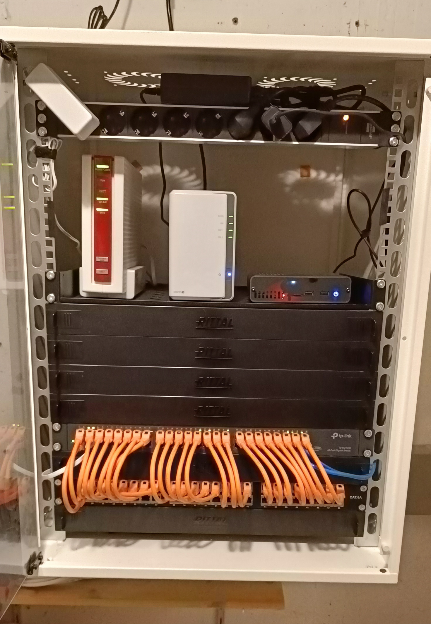 Ich hab in meinem Häuschen einen 19"-Serverschrank im Keller mit Patchpanel, Switch, Modem/Router, Synology Diskstation und einem Raspberry Pi, wo noch ein bisschen Platz ist (siehe Bild).