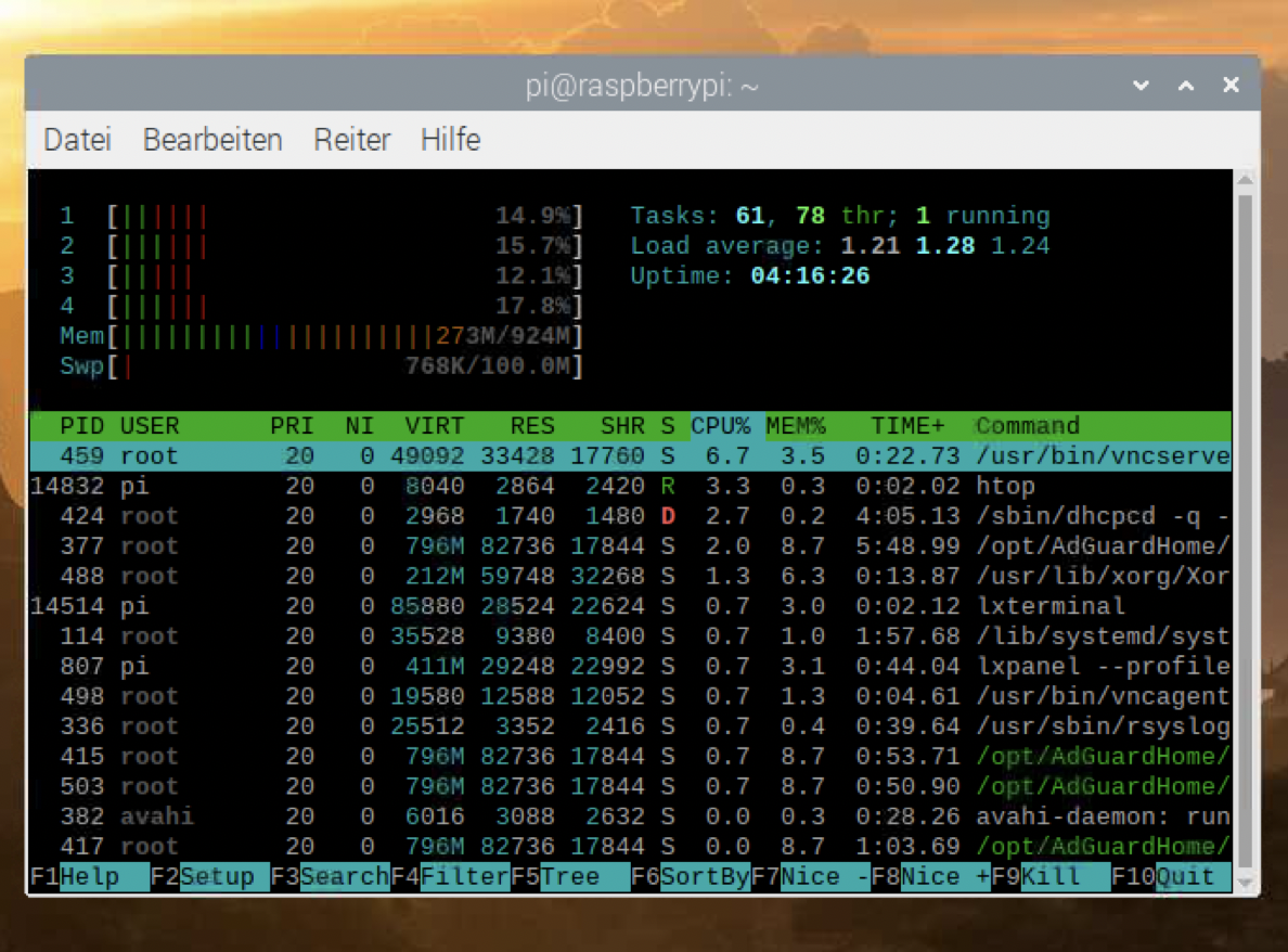 ich teste aktuell Adguard Home auf einem Raspberry und würde mir gerne am Raspberry Pi im OS die aktuelle CPU und RAM Auslastung anzeigen lassen um einzuschätzen ob ich es eventuell z.B. mit dem Umfang der Filterlisten übertrieben habe. An welcher Stelle kann ich mir die entsprechenden Werte anzeigen lassen?