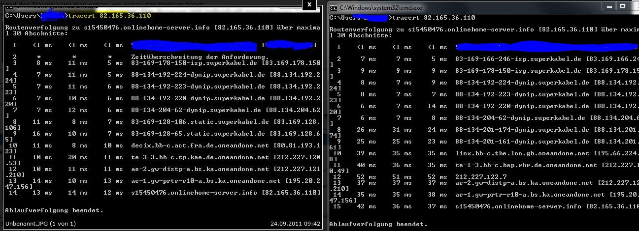 Außerdem habe ich - zum Glück - ein Tracert von vor dem Problem und jetzt (siehe Screenshot). Dort sieht es so aus, alsob die ersten Hops recht gut sind, nur dann bremst etwas zwischendrin.
