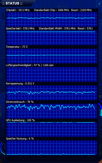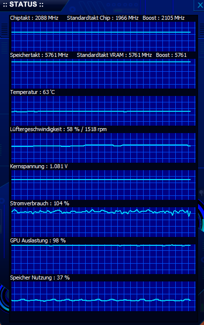Um die Stabilität der Einstellungen zu prüfen habe ich den Graphics Test 1 des aktuellen 3DMark auf maximalen Settings etwas über eine halbe Stunde im Loop laufen lassen, das Palit Tool lieferte dann folgende Werte: