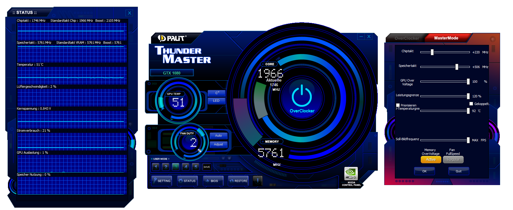 Passend zur "Palit GeForce GTX 1080 GameRock Premium Edition" hab ich das Palit eigene Tool "Thundermaster" installiert, nach ein bisschen Google-Recherche habe ich hier: http://www.ocdrift.com/review-palit-geforce-gtx-1080-gamerock-premium-edition/11/ beispielhafte OC Werte gefunden, und diese entsprechend im Tool eingetragen (siehe rechts):