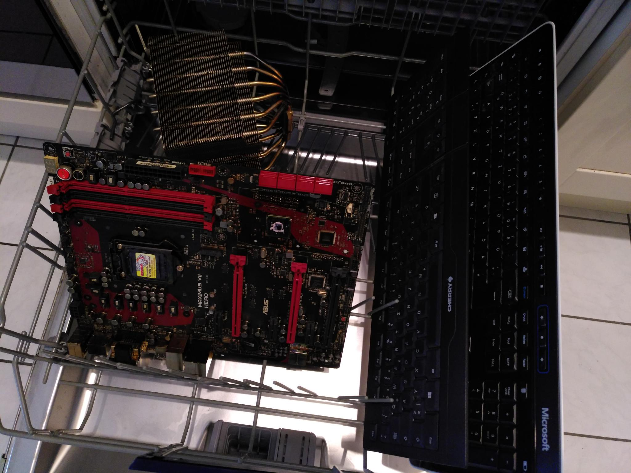Vor einigen Jahren als ich noch zu Hause lebte habe ich mal ein altes Mainboard in die Spülmaschine gehauen, sollte damals ein Medien-PC werden. Es handelte sich dabei um ein Asrock z68 pro 3. Hatte damals auch davor das "der Bauer" Video gesehen und dachte mir "Ja, ja bla bla...ich popel da jetzt sicher nicht das Salz aus der Spülmaschine". Habe das Ding also einfach so wie es war in die Spülmaschine geknallt und weil ich wollte dass der Dreck auch wirklich abgeht und das Board ohnehin nichts mehr wert war auch noch einen Spülmaschinentab dazugeworfen