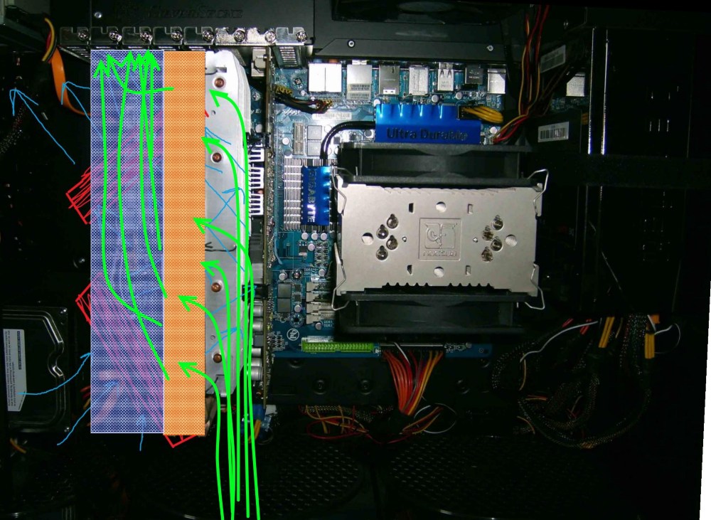 Auch denke ich, dass der Kühler der rausbläst die Luft sofort vom ersten Lüfter total verwirbelt und dadurch die Luft gar nicht richtig an die Graka kommt. Die Temps werden wahrscheinlich steigen.
