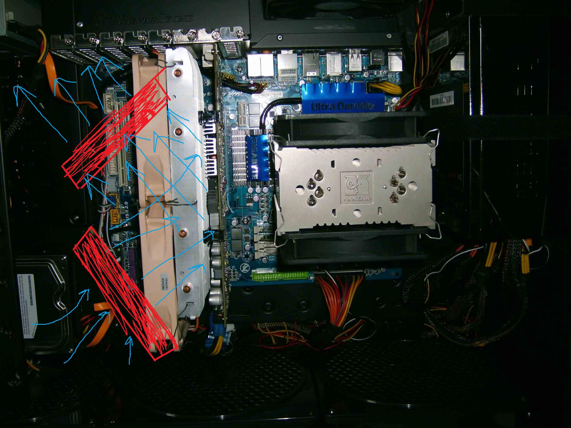 als ich gerade in mein Gehäuse geschaut habe machte ich mir darüber Gedanken die zwei NF-P12´er, die an dem Accelero S1 auf der 4870 hängen, auf eine andere Art zu befestigen, da die Luft scheinbar nicht effizient genug das Gehäuse verlässt.
