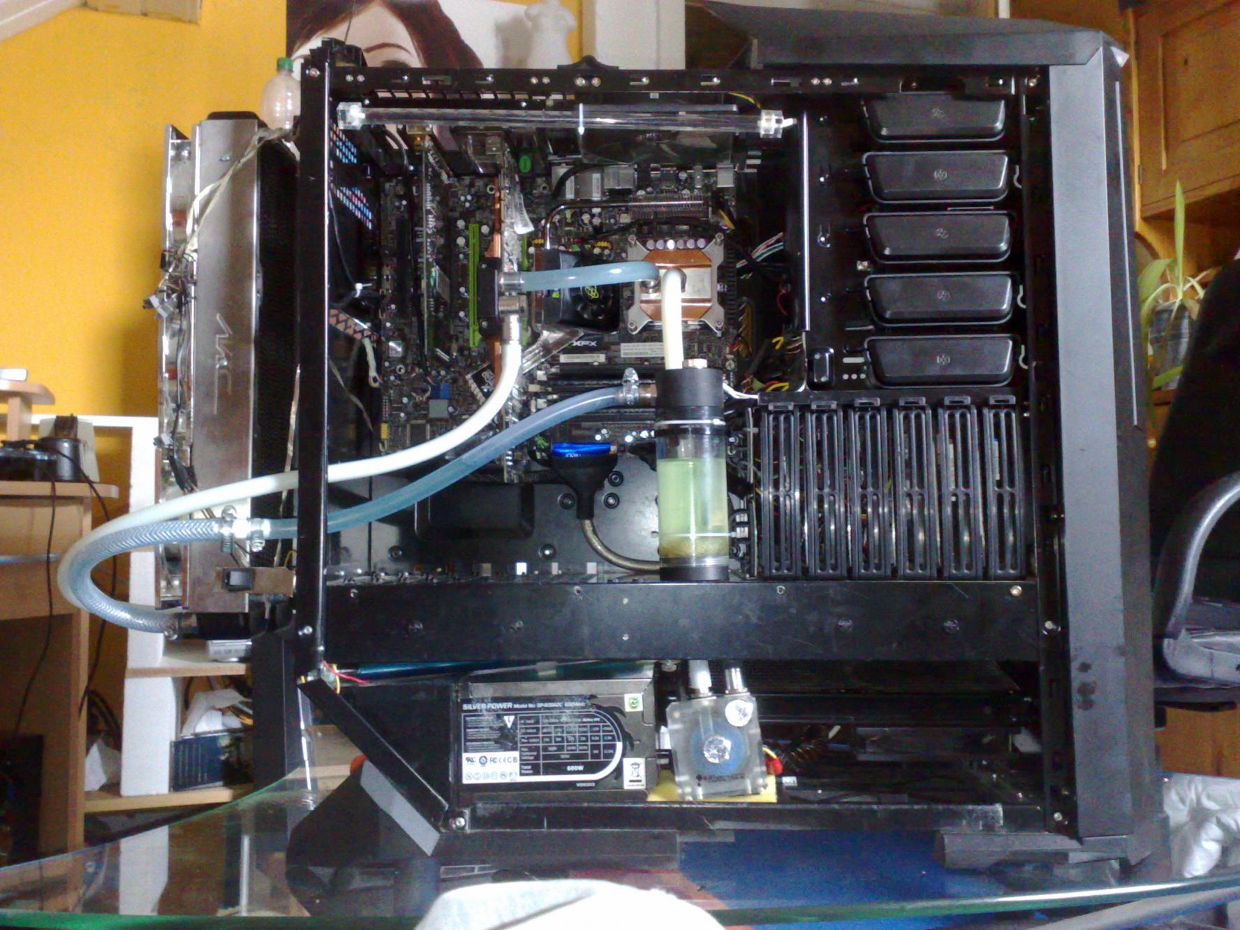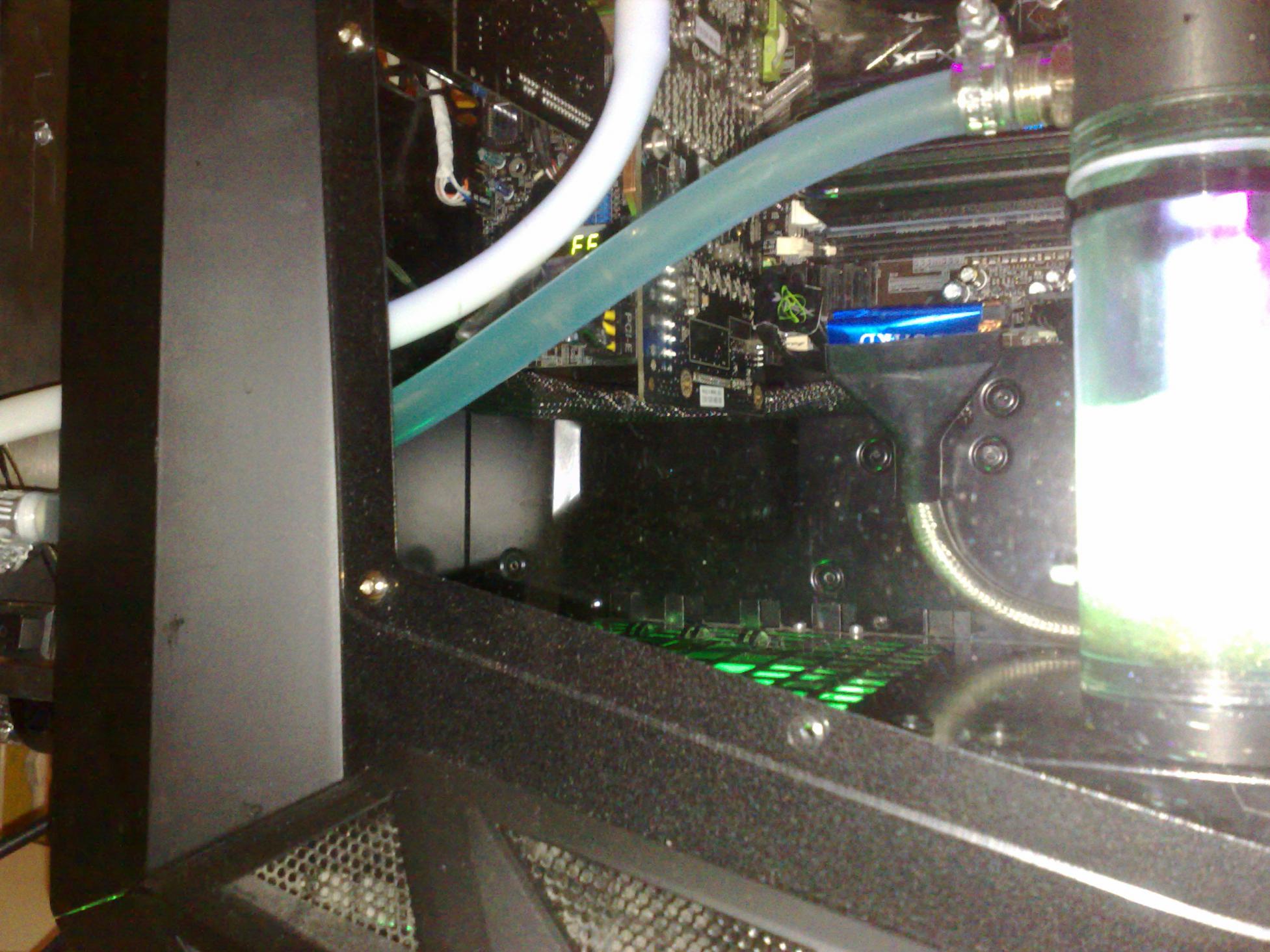 Wiso hast du nicht gleich noch die Grakas unter Wasser gesetzt? Ach und den Lüfter auf dem Chipsatzkühler würd ich abmachen oder gegen nen Wasserkühler tauschen, sonst ist der Silenteffekt der Wakü gebrochen. Modding ist auch was anderes...Aber schönes Sys.