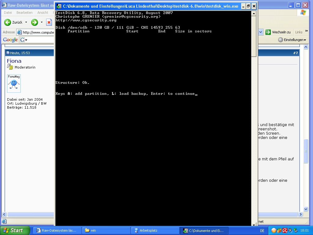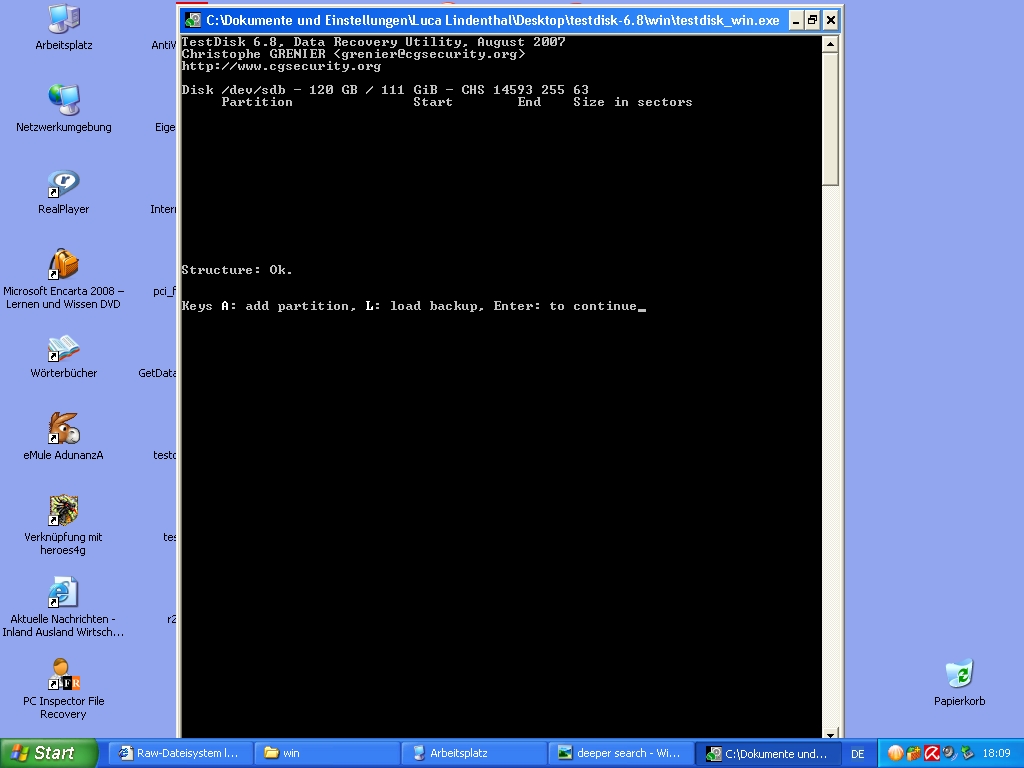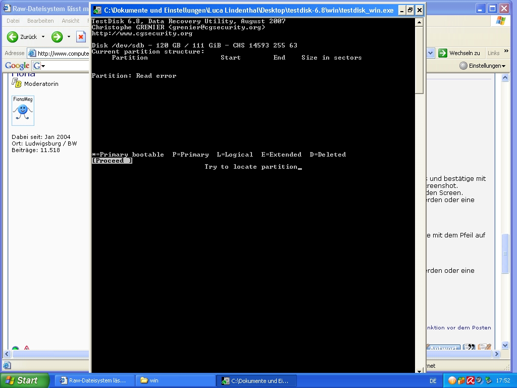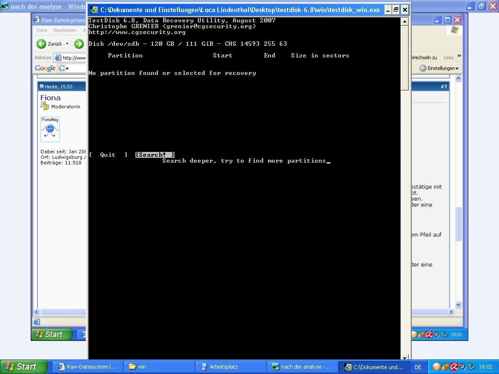 Hab mich sofort im internet informiert und verschieden Beiträge gelesen, in welchen ähnliche probleme hauptsächlich mit GetdataBack for Nfts, restorer2000pro, Pc inspectorfile Recovery 2000 oder mit testdisk gelöst worden sind. Ich habe mir die programme runtergeladen aber komme einfach nicht weiter; bei getdataback liest er nur fehler und findet keine dateisysteme. auch bei testdisk erscheint das laufwerk, die analyse liefert mir aber keine partitionen sondern nur read error 2.. Ähnlich bei restorer 2000pro findet er das laufwerk allerdings unter den namen Samsung120JCYL10, bei einem Scan kommt die fehlermeldung 'can not reconstruct file system on Samsung120JCYL10'. Bei Pc inspectorfile Recovery 2000 erscheint bei der start durchsuchung der laufwerke ein NT_read error: error no.2 Drv:129 Lba:0, blocks:1 . Dann wird es mir als physikalisches Laufwerk angezeigt, für welche ich die datenrettung allerdings nicht durchführen kann!