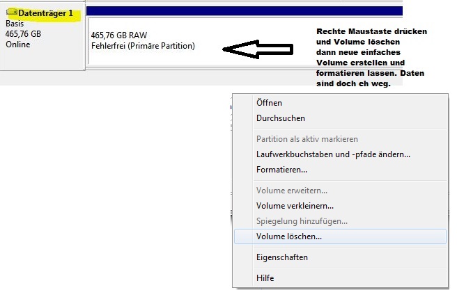 Formatieren lässt sich die Platte nicht und es lässt sich auch das Volume nicht löschen. Beim Versucht zu formatieren kommt "Formatierung fehlgeschlagen" und bei Volume löschen kommt "CRC Fehler".