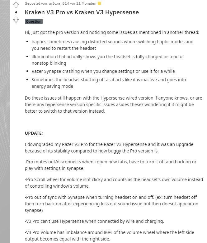 Nun das Razer Kraken V3 Pro = wunderbarer Sound und brachiales Hypersense aber auch Verbindungsprobleme.