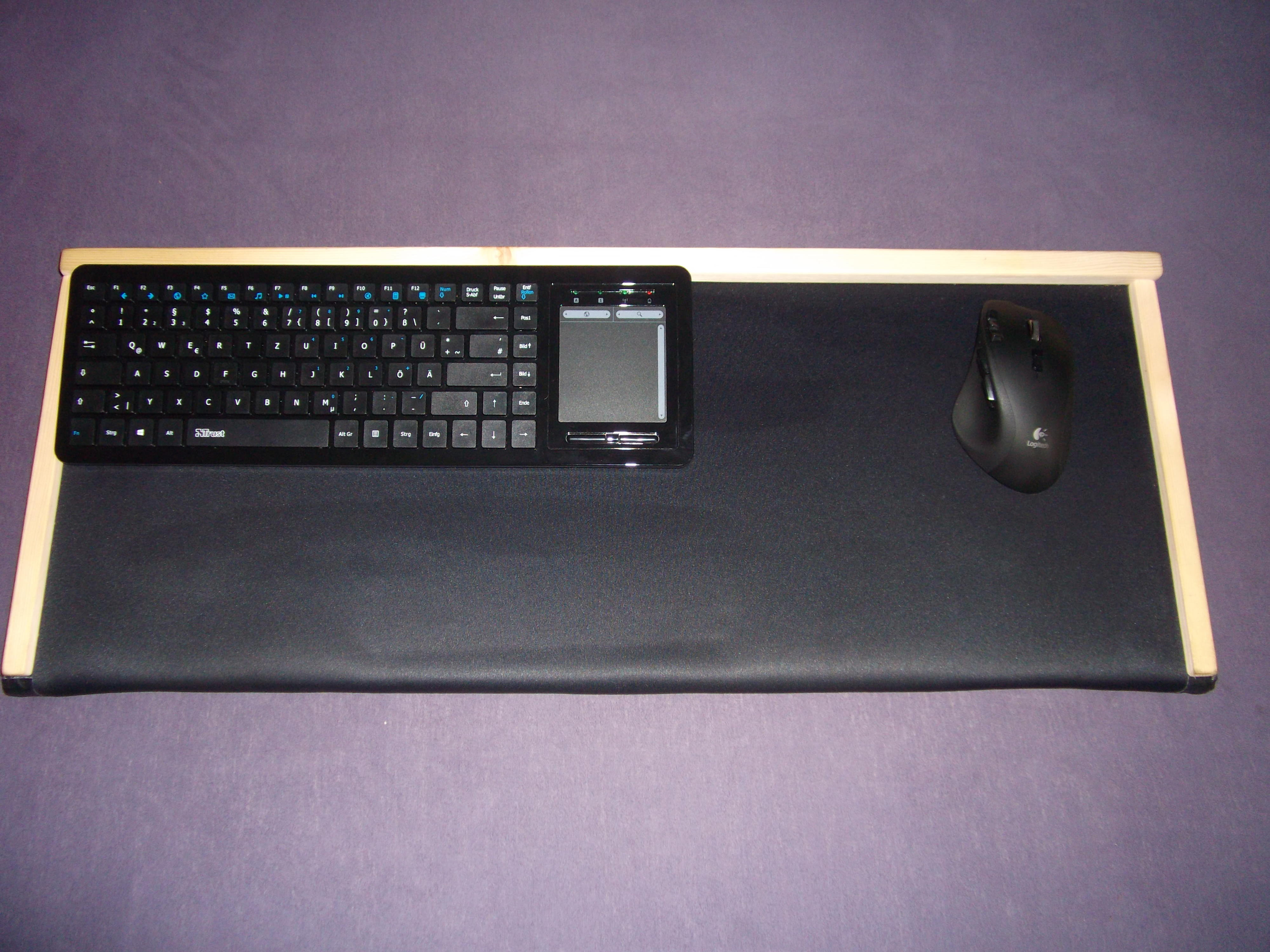 Die Tastatur liegt auf den Oberschenkeln, das Mauspad (ein riesen Vieh weil wegen Lowsense) liegt neben mir und wird durch eine PVC Platte unterstützt. So ermüden die Arme nicht so stark und ich konnte bequem über Stunden spielen.