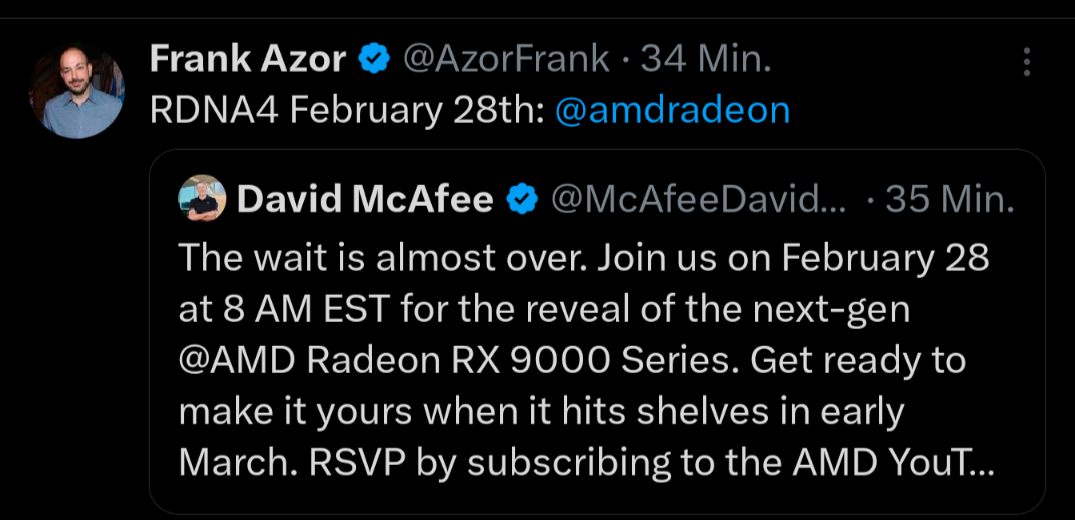 Frank Azor kündigt bei Twitter RDNA 4 für den 28.02. an. Es wird langsam spannend.