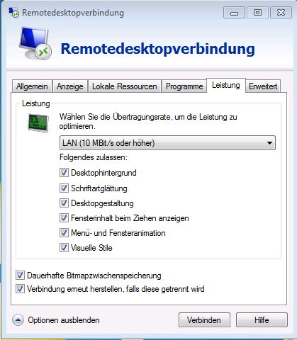 Ja hier in der Firma haben wir die Einstellung "LAN 10Mbit/S" aber die Kollegen, die aus Frankreich oder gar Hong Kong auf den Terminalserver zugreifen, müssen individuell an den Einstellungen schrauben, da sonst die Performance sehr träge ist.