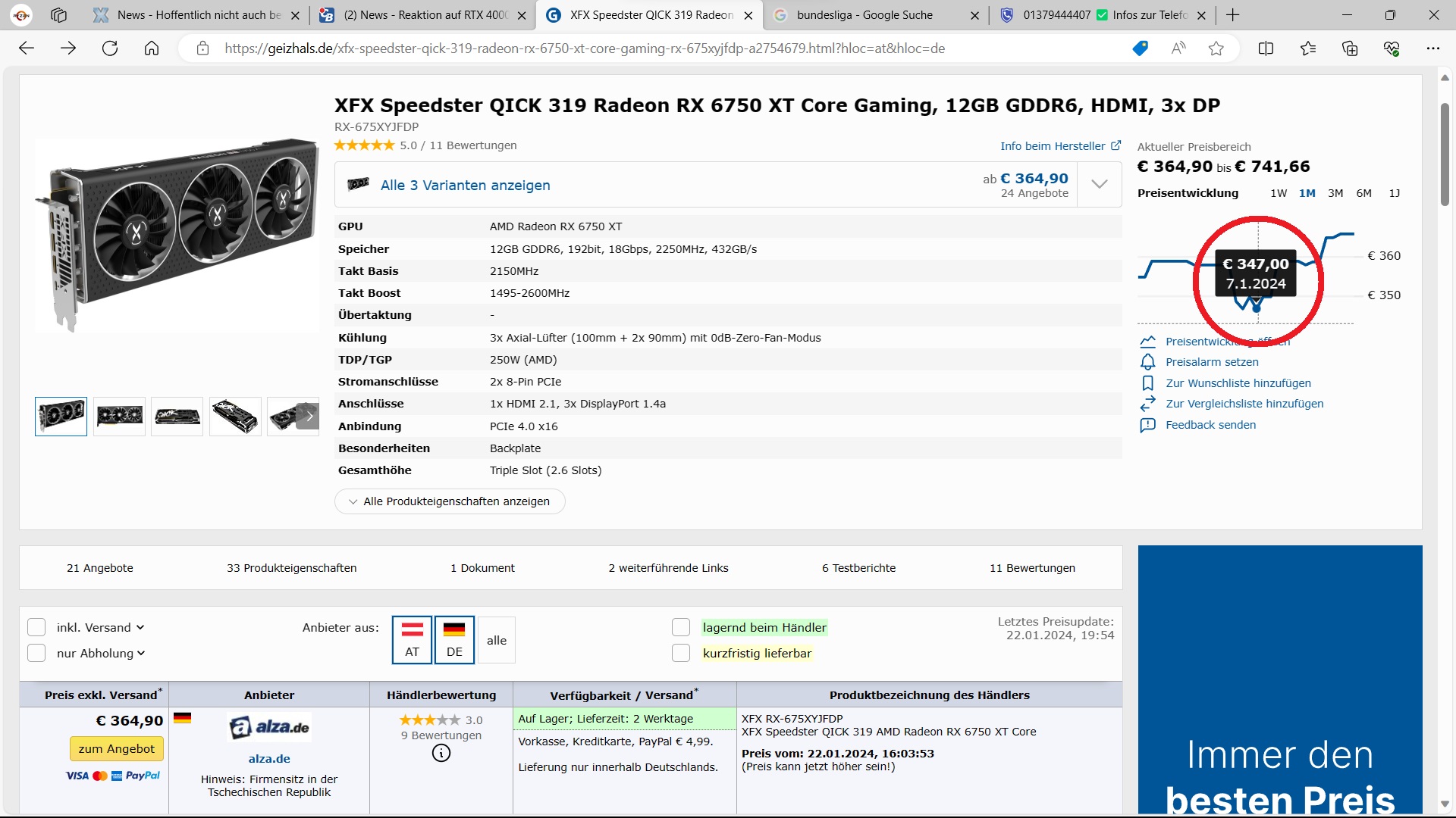 oder eine 6750 XT (12 GB/FullHD) schon für 347 € (just 18 € mehr) ...