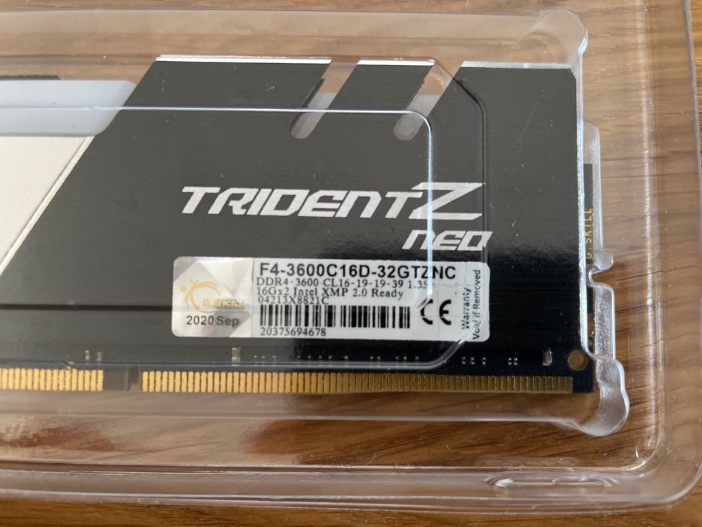 Demnach würde ich jetzt also doch aus 2x 16GB gehen. Die eingangs erwähnten Crucial sind ja ziemlich sicher SR, von den gebraucht angebotenen Trident habe ich nun dieses Bild bekommen, da feht aber eine Info zum Ranbk